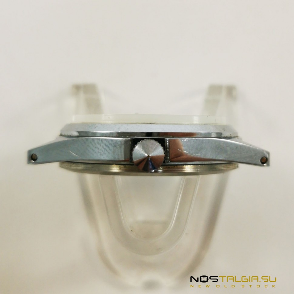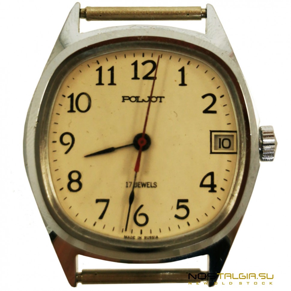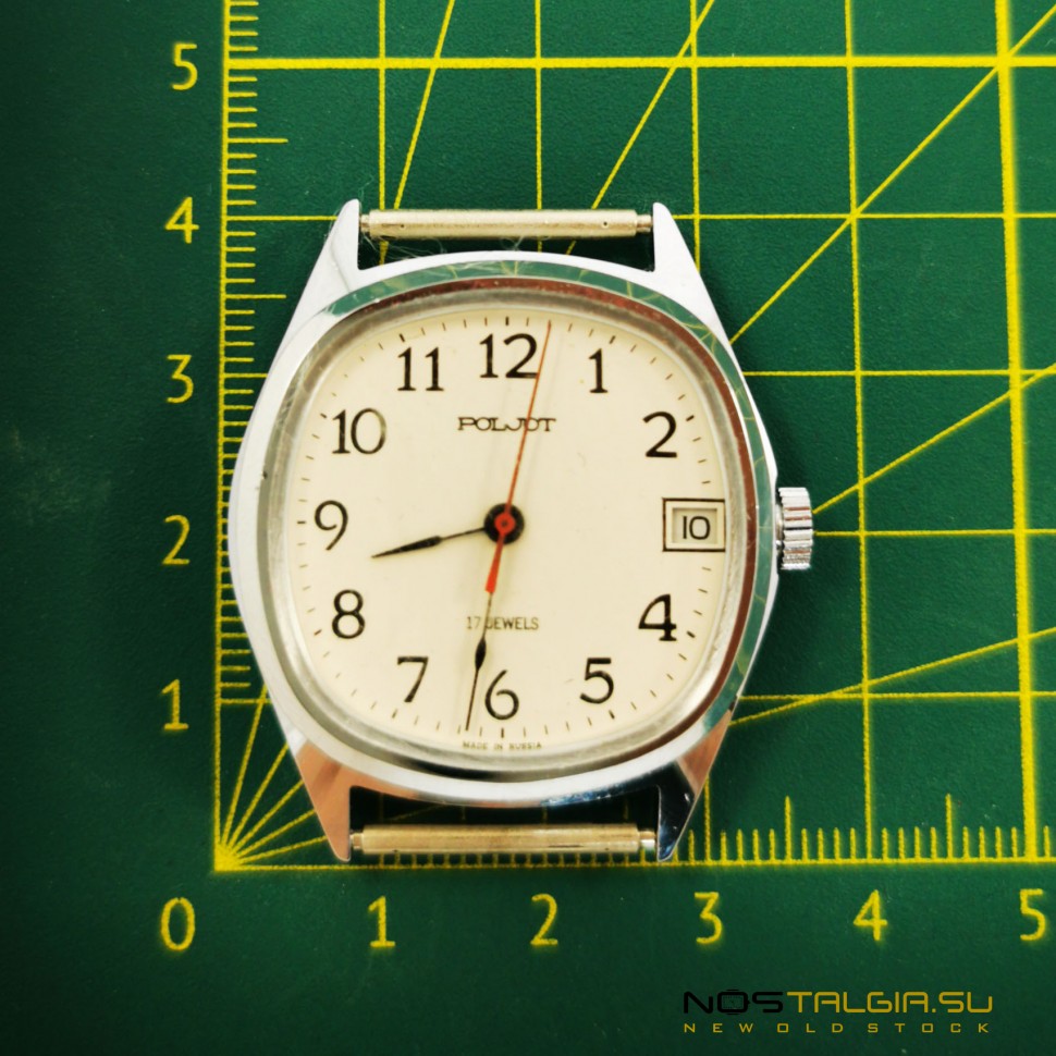 Die mechanische Armbanduhr Poljot wurde von der Ersten Moskauer Uhrenfabrik in der Sowjetunion hergestellt. Zuvor in sorgfältiger Verwendung, Chromkörper in gutem Zustand. Der technische Zustand der Uhr ist ausgezeichnet, der Mechanismus 2609-N auf 17 Rubinsteinen ist voll funktionsfähig (genau im Hub). Das weiße Zifferblatt verfügt über schwarze arabische Ziffern und einen Sofortkalender an der Seite. Lieferumfang: Uhr, Markenbox. Abmessungen: 41 mm x 37 mm (Breite mit Krone), Bandbasisbreite: 18 mm. Lieferung in jede Stadt der Welt.