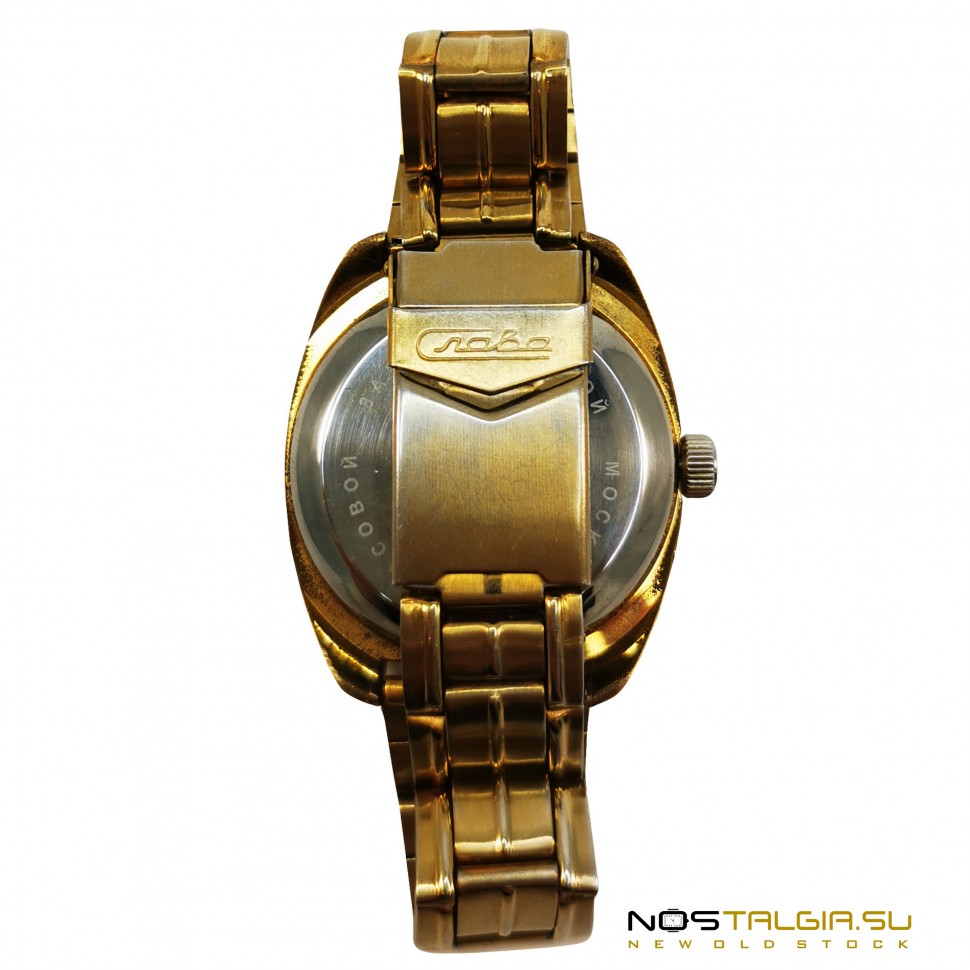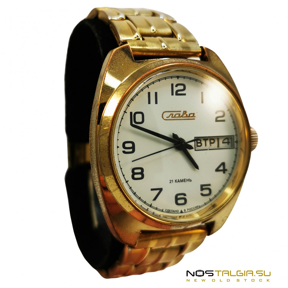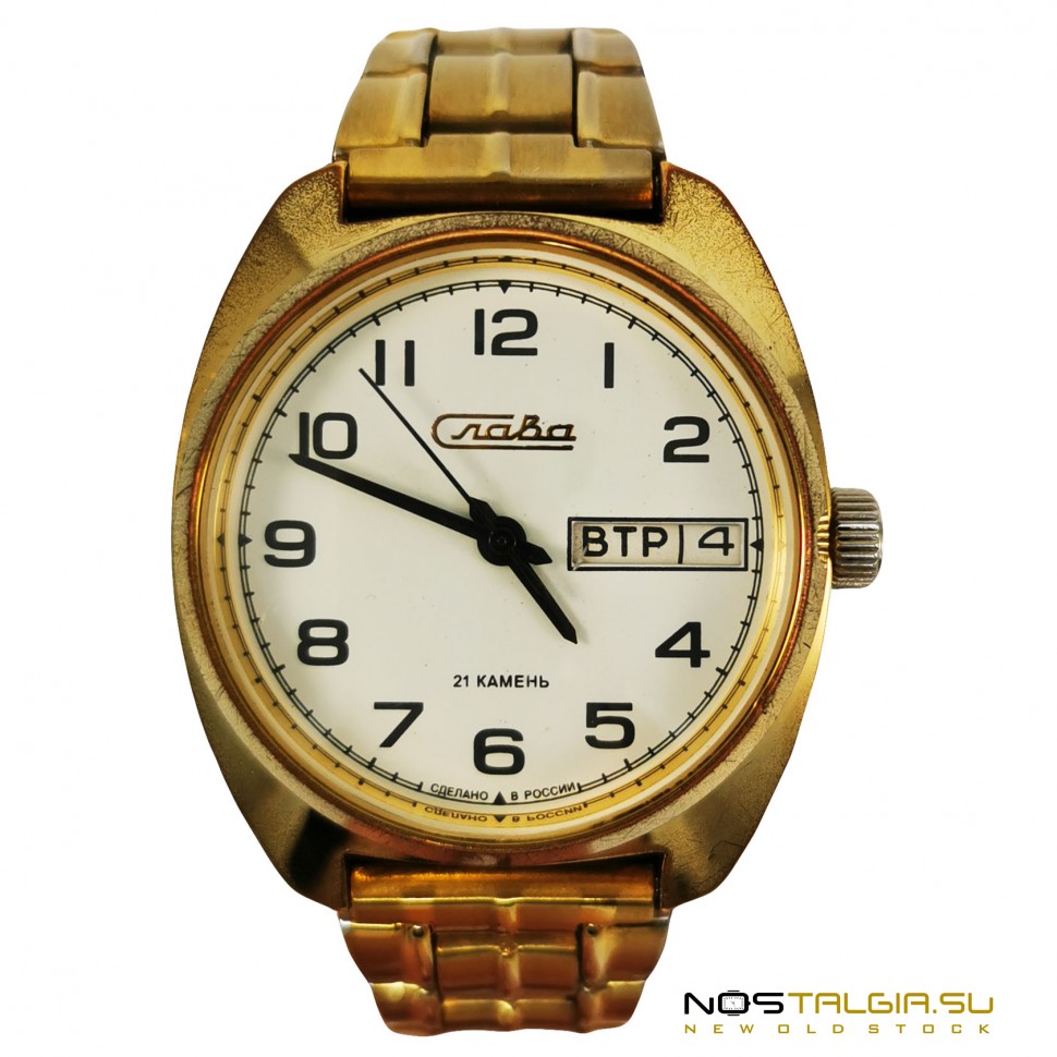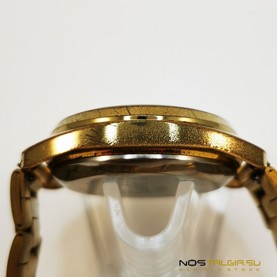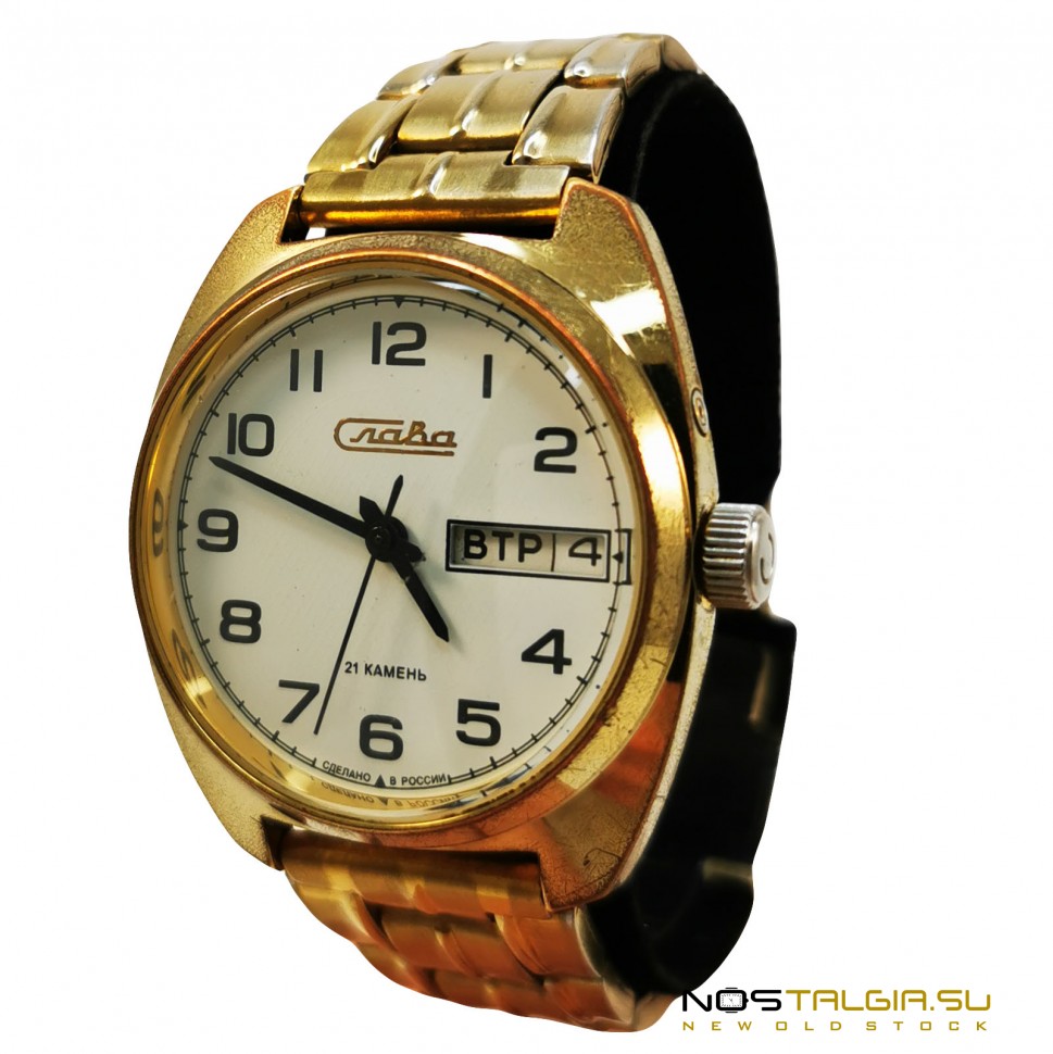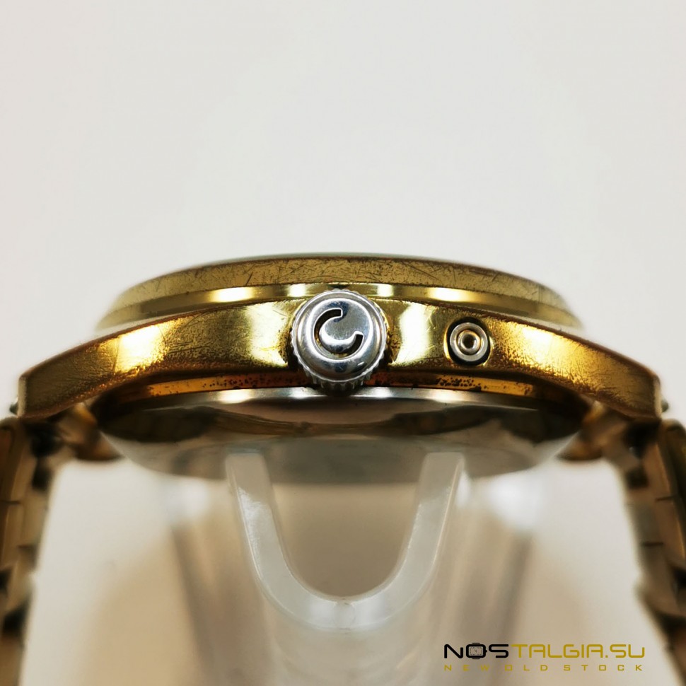 Die Slava-Uhr mit dem Kaliber 2428 ist neu aus der Lagerung und wurde in Russland (Moskau) vom zweiten Uhrwerk hergestellt. Guter Zustand (siehe Foto) des Gehäuses , der Mechanismus auf dem 21. Rubinstein ist voll funktionsfähig, auf genauem Weg. Auf dem Zifferblatt mit arabischen Ziffern befindet sich ein doppelter Sofortkalender, der die aktuelle Uhrzeit und den Wochentag anzeigt. Im Lieferumfang enthalten: Uhr, Armband Fabrik, branded Box. Abmessungen: 46 mm x 43 mm (Breite mit Krone), Breite des Armbandsockels: 18 mm. Lieferung in jede Stadt der Welt!!!