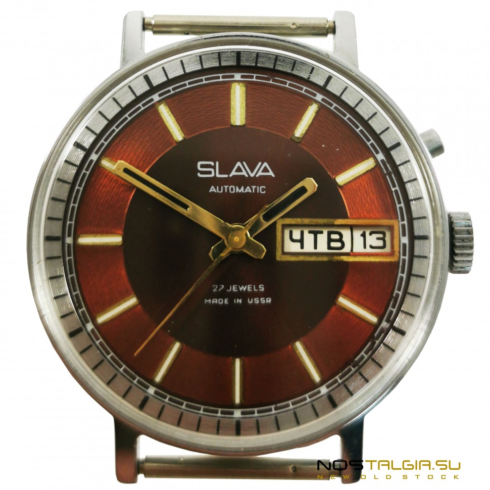 Chromuhr "Slava" UdSSR mit automatischem Aufzug und Doppelkalender, mechanisch, neu aus dem Lager