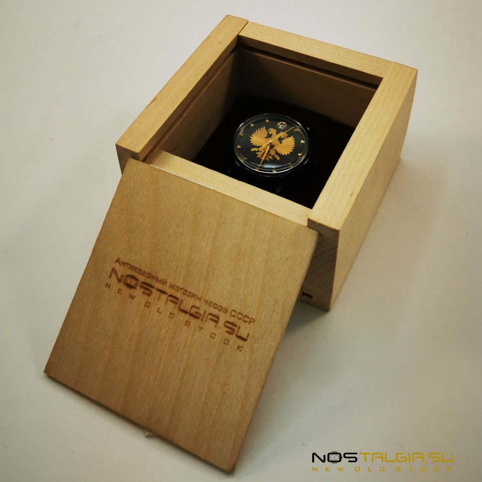 Mechanische Uhr "Raketa" 2614 - N, 1992 in St. Petersburg veröffentlicht. Das schwarze Zifferblatt zeigt einen Doppeladler mit einer ungewöhnlichen Anordnung eines Sofortkalenders (siehe Foto). Die Uhren sind neu, die ganze Zeit in einer Privatsammlung. Der Mechanismus an 19 Rubinsteinen wurde 2020 von einem Uhrmacher prophylaxiert. Abmessungen: 40 mm x 39 mm (Breite mit Krone), Bandbasisbreite: 18 mm. Lieferumfang: Uhr, Reisepass mit passender Nummer, schwarzes Lederarmband und Fabrikbox. Lieferung in jede Stadt der Welt.