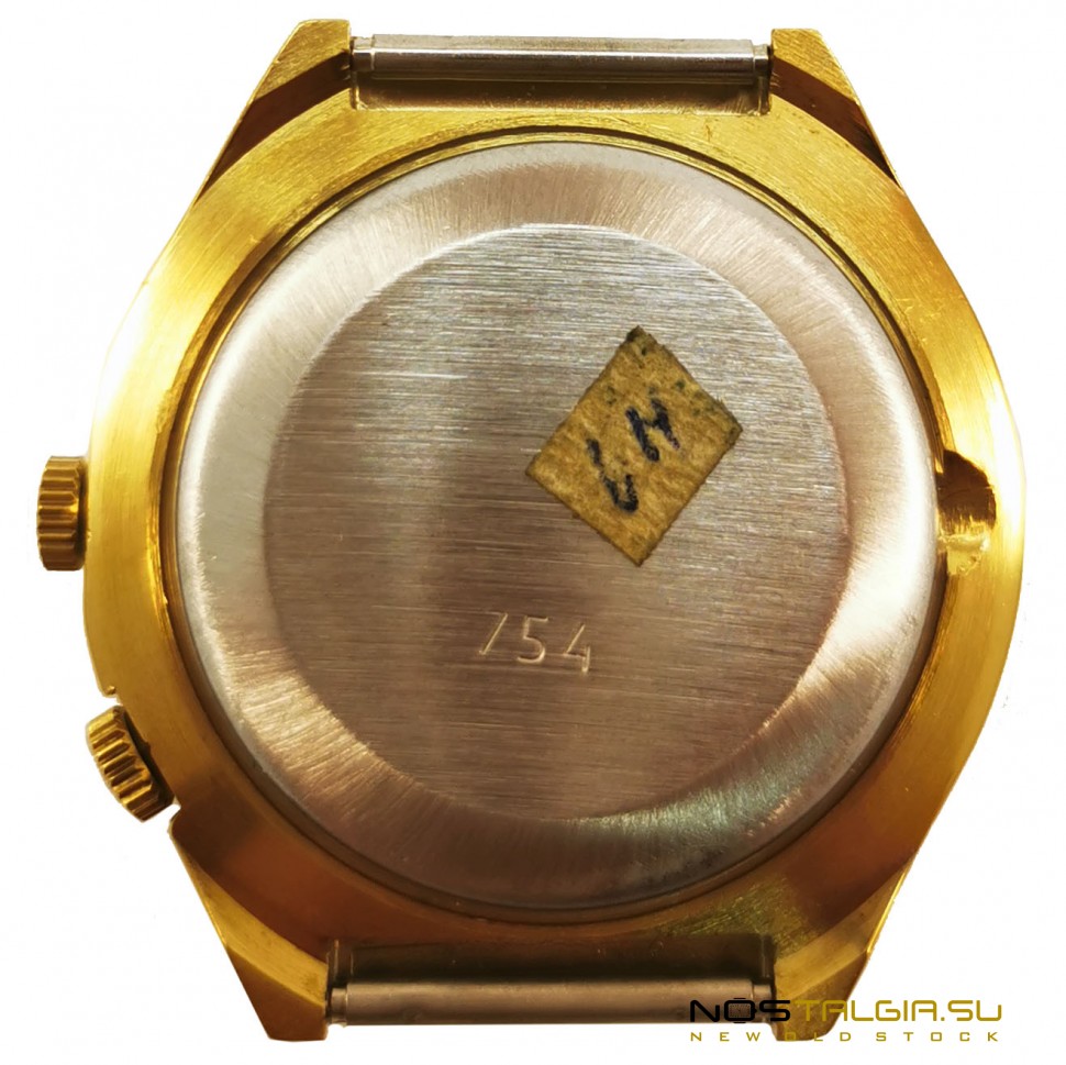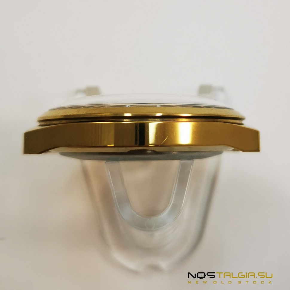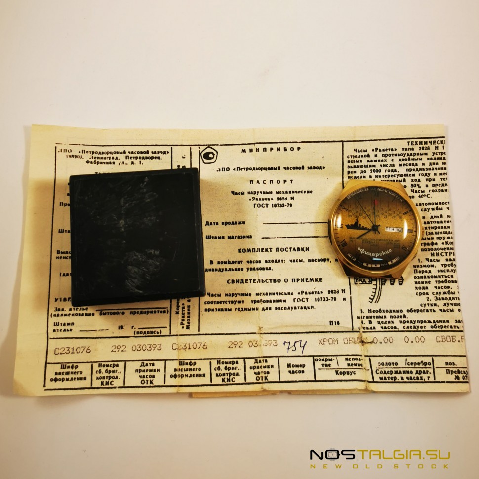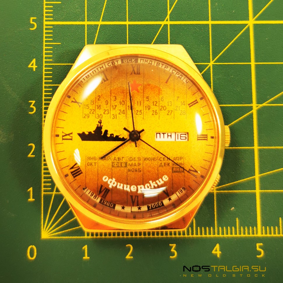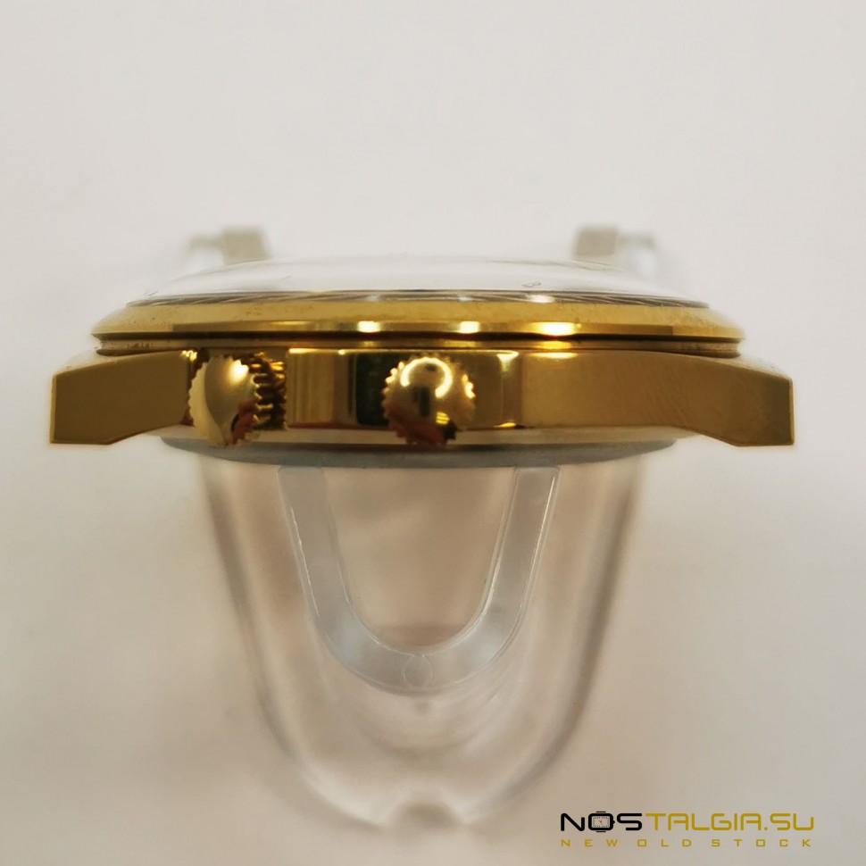 Die äußerst seltene mechanische Uhr "Rocket" 2628 Offizier - "Ewiger Kalender" wurde in der Sowjetunion (1991) vom Petrodwortz-Uhrwerk hergestellt. Das Gehäuse ist in einwandfreiem Zustand, der Mechanismus wurde im Jahr 2020 einer professionellen Prävention unterzogen. Das goldfarbene Zifferblatt mit dem Bild eines Kriegsschiffes enthält einen "Ewigen Kalender" und einen doppelten Sofortkalender mit der aktuellen Uhrzeit und dem Wochentag. Im Lieferumfang enthalten: eine Uhr, eine Fabrikbox, ein Reisepass mit übereinstimmenden Nummern. Maße: 45 mm x 43 mm (Breite mit Krone), Breite des Armbandes: 18 mm. Sie können seltene Uhren der UdSSR jederzeit in unserem Online-Shop zu günstigen Preisen mit Garantie kaufen. Lieferung in jede Stadt der Welt.
