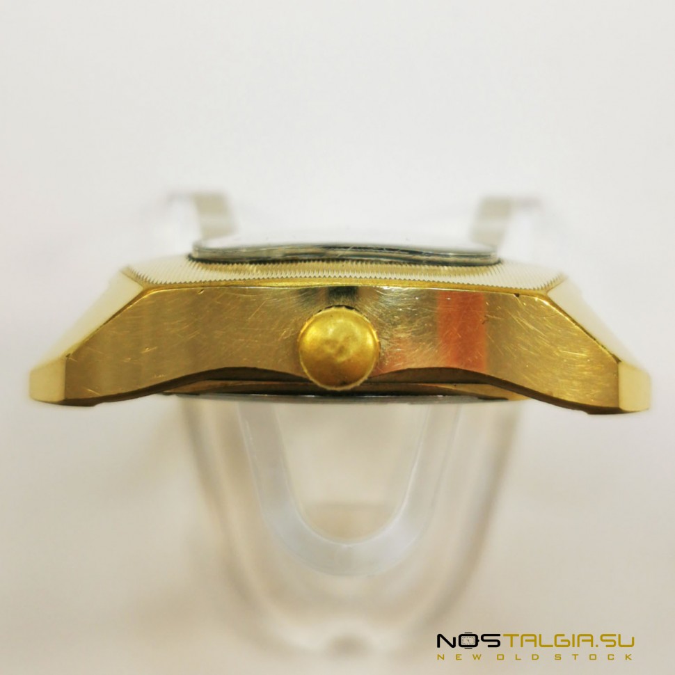 Die mechanische Uhr "Rocket" 2628-H wurde 1974 in der Sowjetunion hergestellt, das Modell wurde im Volksmund als "Großer Fernseher" bezeichnet. Die Uhr war noch nie im Einsatz (es gibt Mikrokratzer aus der langen Lagerung), der gute Zustand des Gehäuses. Das schwarze Zifferblatt mit Doppelkalender (Wochentag, Zahl) in Kombination mit dem Gehäuse verleiht der Uhr ein teures Aussehen. Der Mechanismus ist vollständig funktionsfähig, es wurde eine Vorbeugung beim Uhrmachermeister durchgeführt. Im Lieferumfang enthalten: Uhr, Fabrikbox. Abmessungen: 44 mm x 42 mm (Breite mit Krone), Breite des Armbandsockels: 20 mm. Lieferung in jede Stadt der Welt.