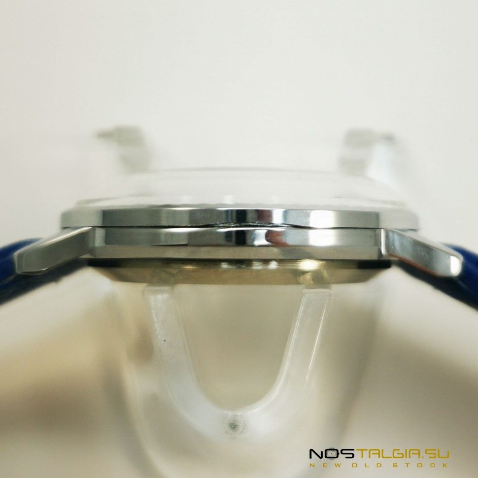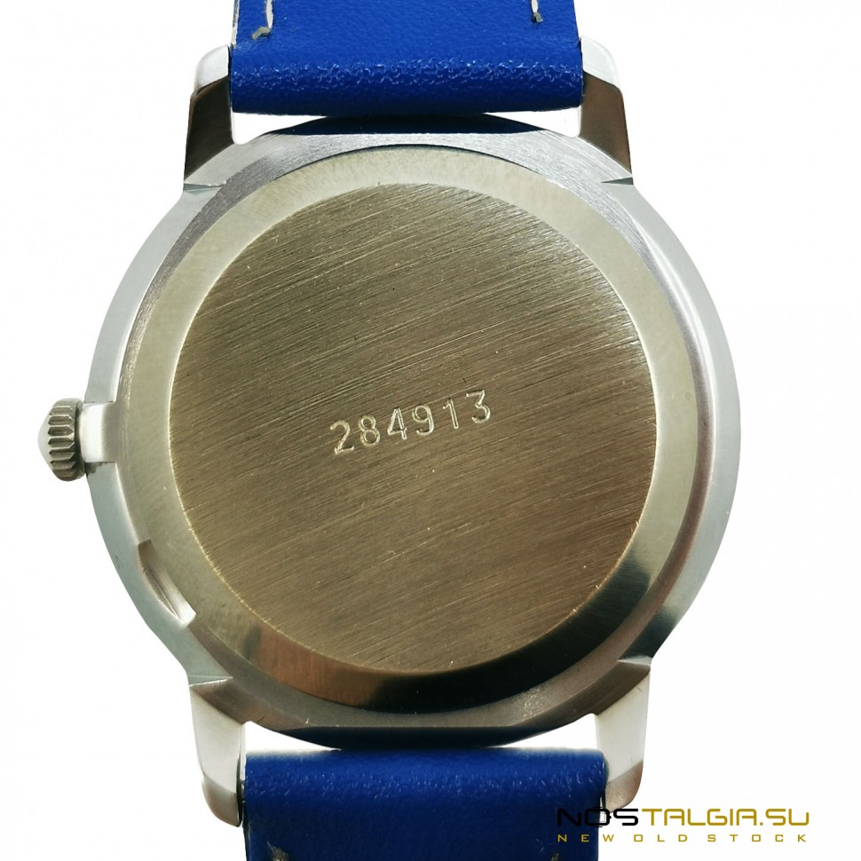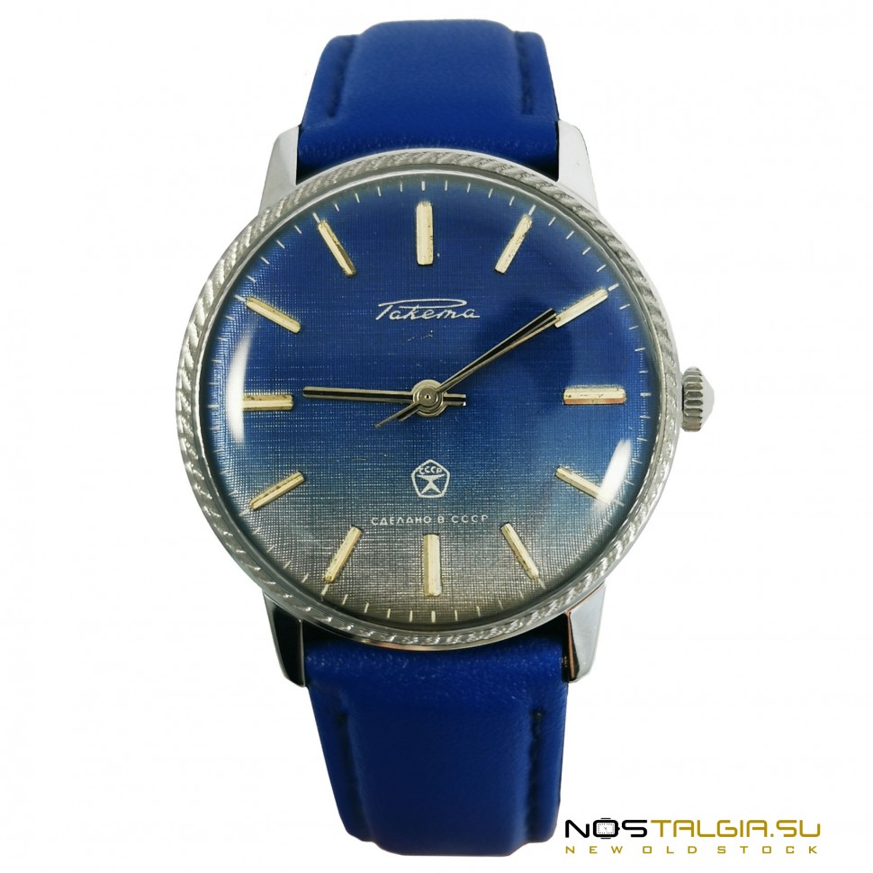 The wristwatch "Rocket" 2609-NA was produced by the Petrodvorets Watch Factory in the Soviet Union (1990). The external condition of the case is excellent (new from storage), the mechanism was fully tested in 2020. The blue dial shows a small sign of the USSR quality. Included: watch, blue leather strap, branded box. Dimensions: 41 mm x 38 mm (crown width), strap base width: 18 mm. You can always buy USSR watches in our online store at reasonable prices with a guarantee. Delivery to any city in the world.