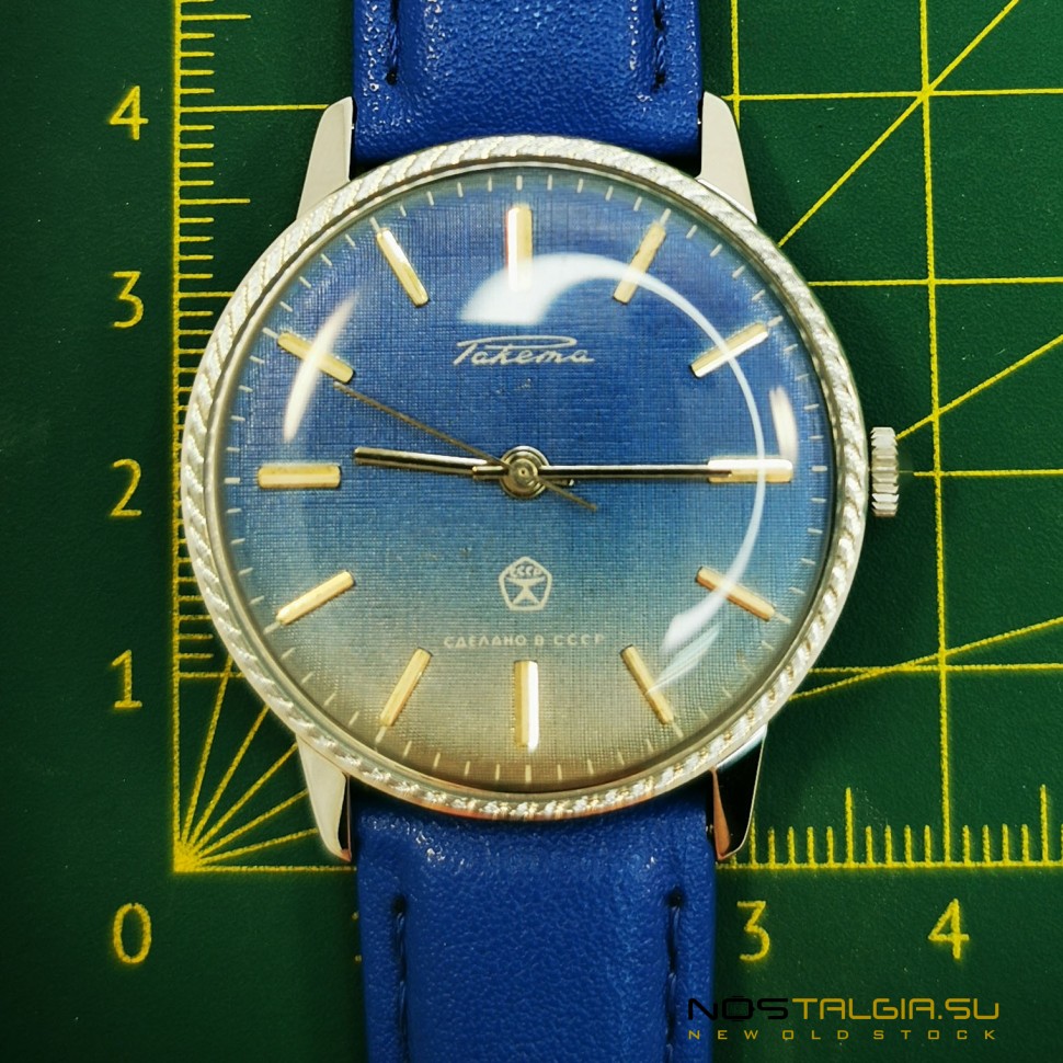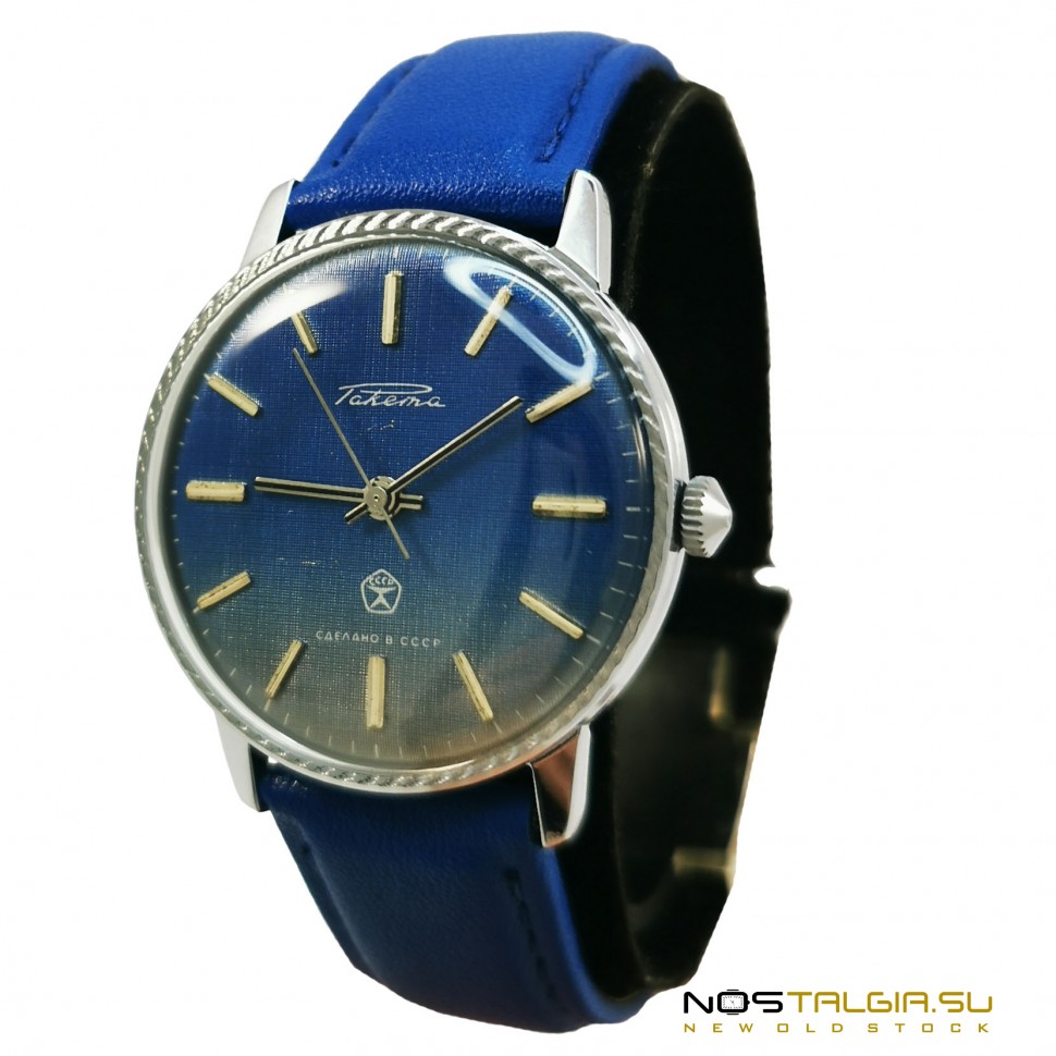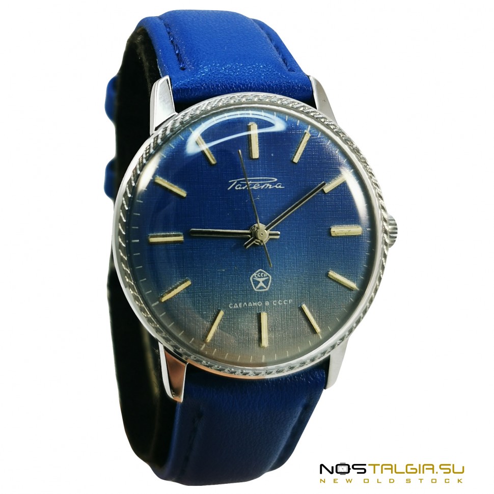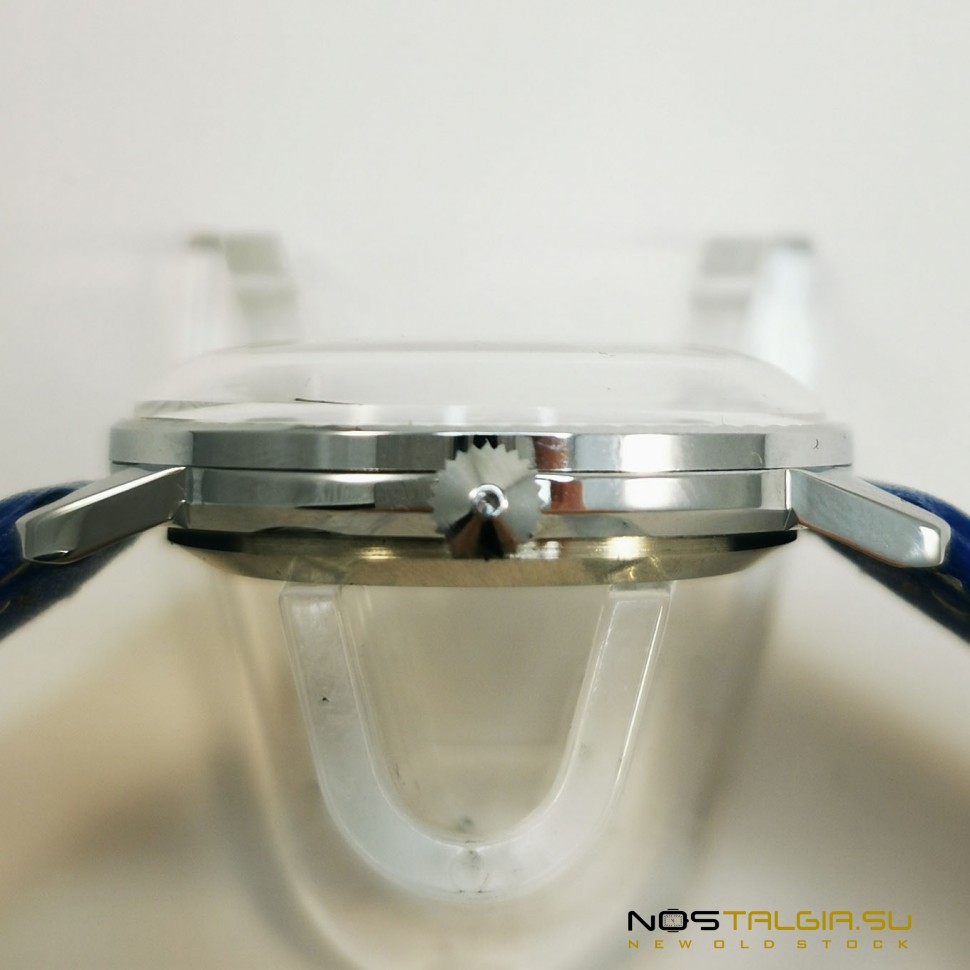 The wristwatch "Rocket" 2609-NA was produced by the Petrodvorets Watch Factory in the Soviet Union (1990). The external condition of the case is excellent (new from storage), the mechanism was fully tested in 2020. The blue dial shows a small sign of the USSR quality. Included: watch, blue leather strap, branded box. Dimensions: 41 mm x 38 mm (crown width), strap base width: 18 mm. You can always buy USSR watches in our online store at reasonable prices with a guarantee. Delivery to any city in the world.