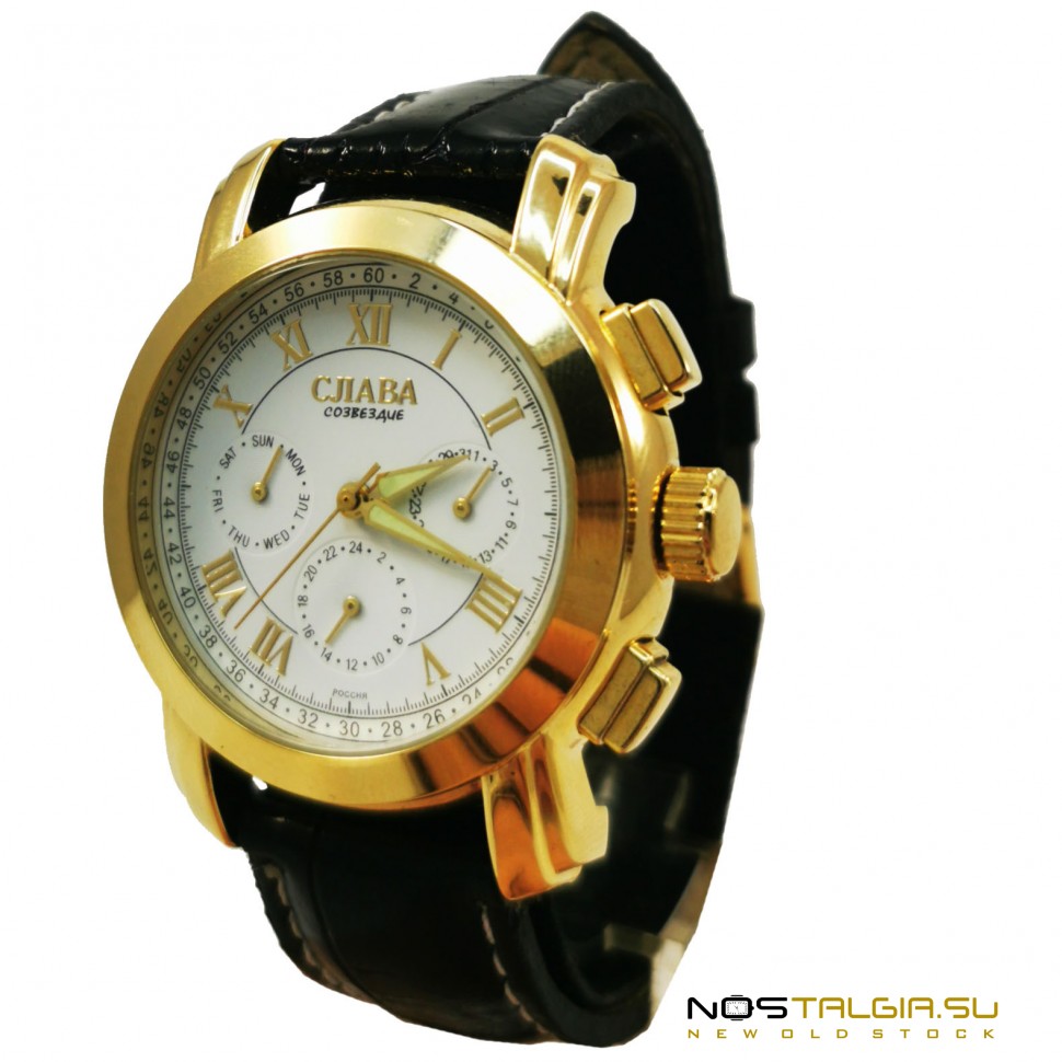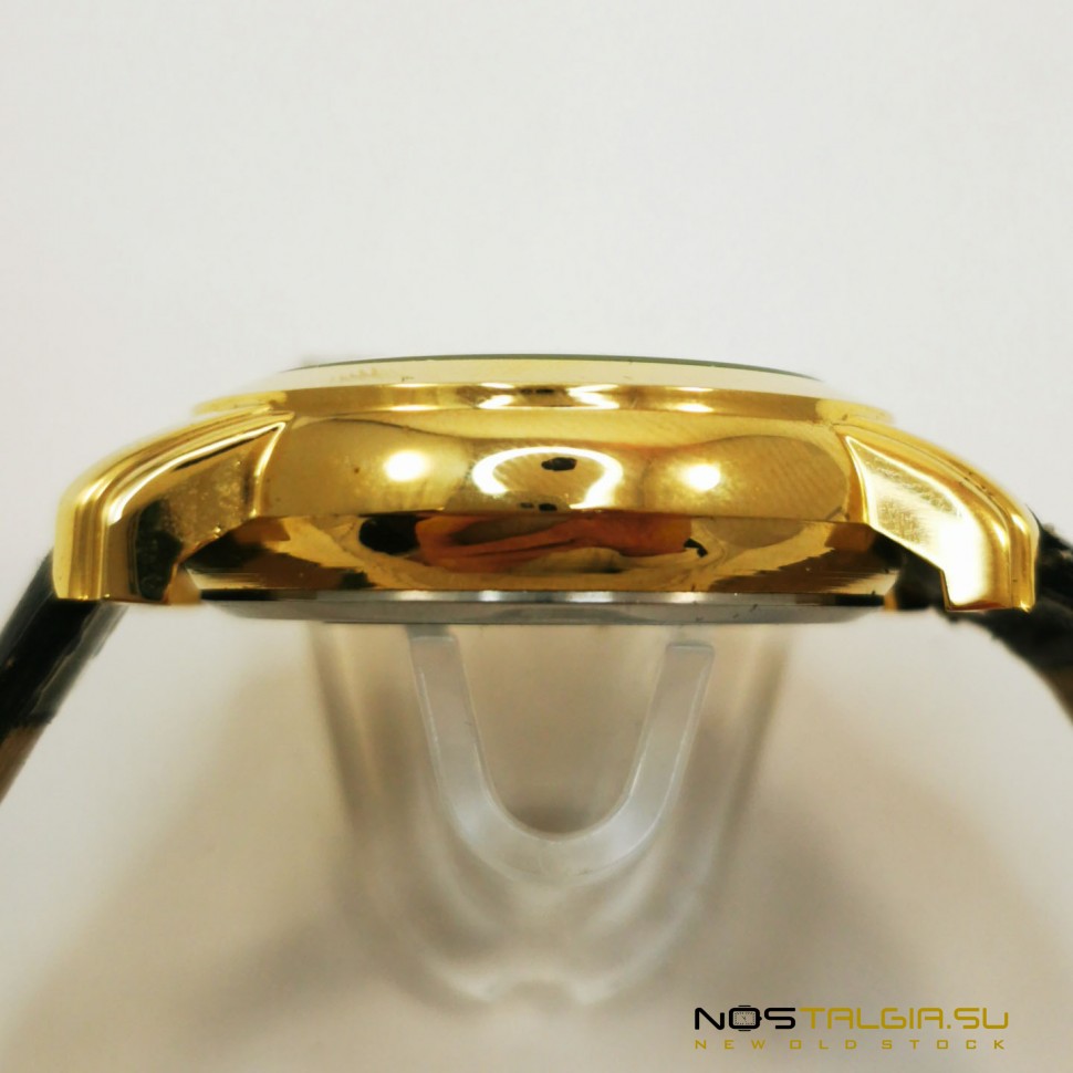 The new mechanical watches "Slava" were produced in Russia by the Second Watch Factory. Excellent external condition of the case, the self-winding movement underwent professional prophylaxis by a watchmaker in 2020. On the white dial there are: a double split instant calendar showing the current day and day of the week and a second hour hand with a 24-hour mechanism (1 full revolution per day). The back cover is made in a combination of metal and glass (* you can see the work of the mechanism) due to which the watch takes on a very expensive look. The set includes: watch with a black leather strap, branded box. Dimensions: 51 mm x 47 mm (width with crown), strap base width: 18 mm. Delivery to any city in the world !!!