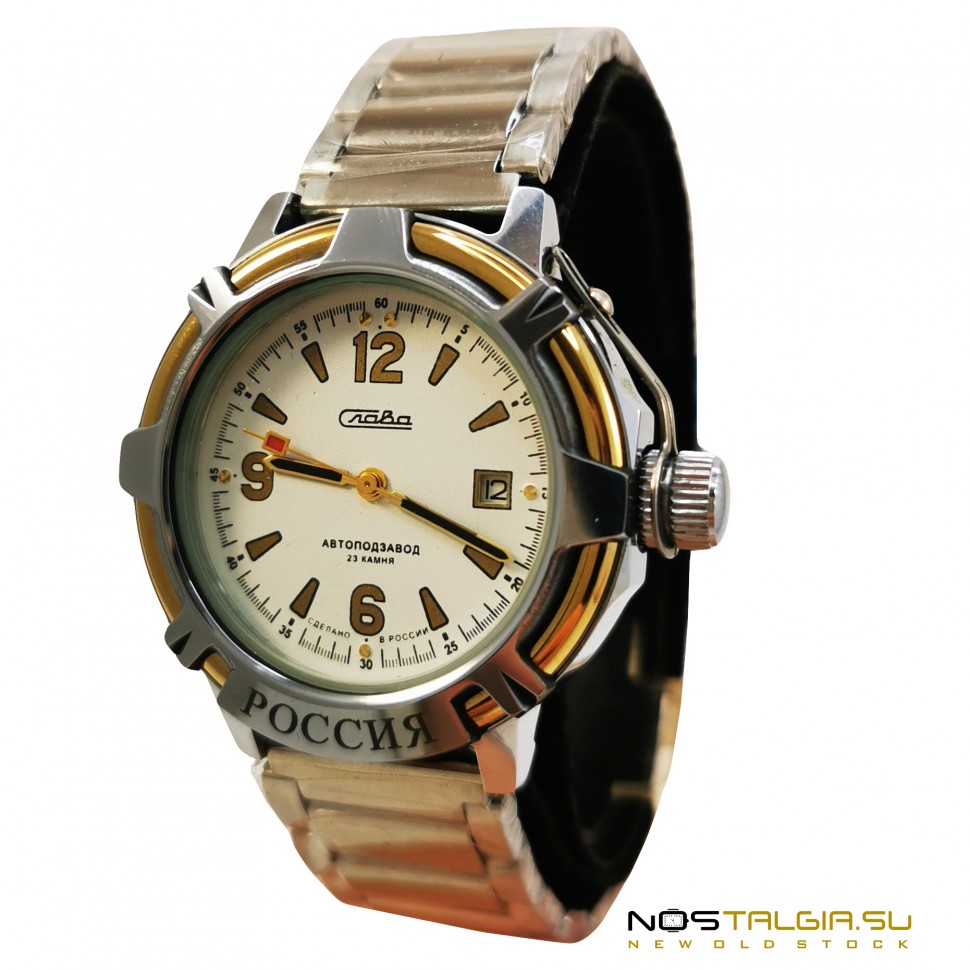 The massive Slava wristwatch is produced in Russia by the Second watch factory. The perfect external condition of the combined case (Flask) with increased water protection and a metal bracelet (located in a protective film), the self-winding mechanism on 23 ruby stones has passed high-quality service in 2021. On a white dial with gold-plated hands, there is an instant side calendar with the current date. The set includes a watch, a metal bracelet with a double lock, and a branded box. Dimensions: 49 mm x 50 mm (crown width), strap base width: 18 mm. Delivery to any city in the world.