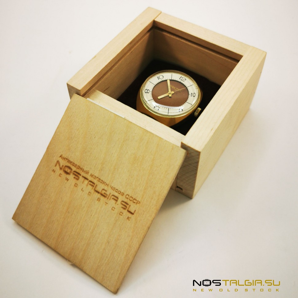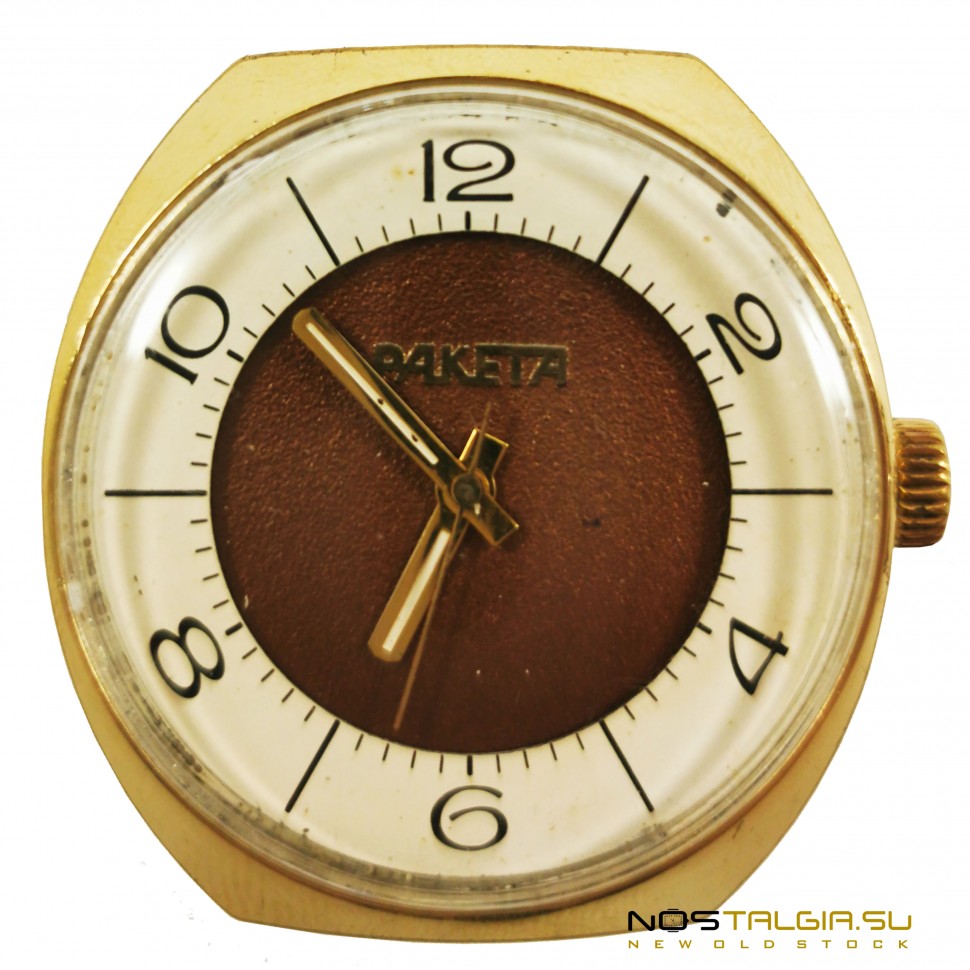 The mechanical watch "Rocket" 2609-NA, previously in careful use, was produced in the Soviet Union by the Petrodvorets Watch Factory. The external condition of the case is good, the mechanism on 18 ruby stones is fully functional, on an accurate course. There are Arabic numerals on the dial. Included: watch, branded box. Dimensions: 42 mm x 42 mm (width with crown), width of the strap base: 18 mm. Delivery to any city in the world.