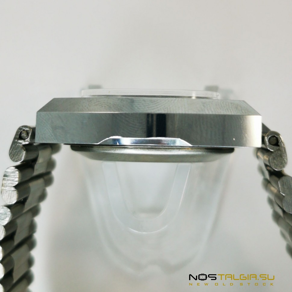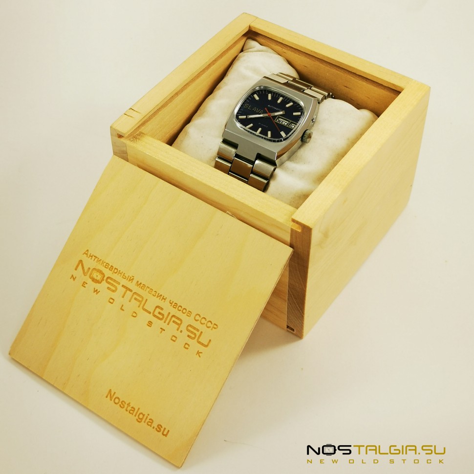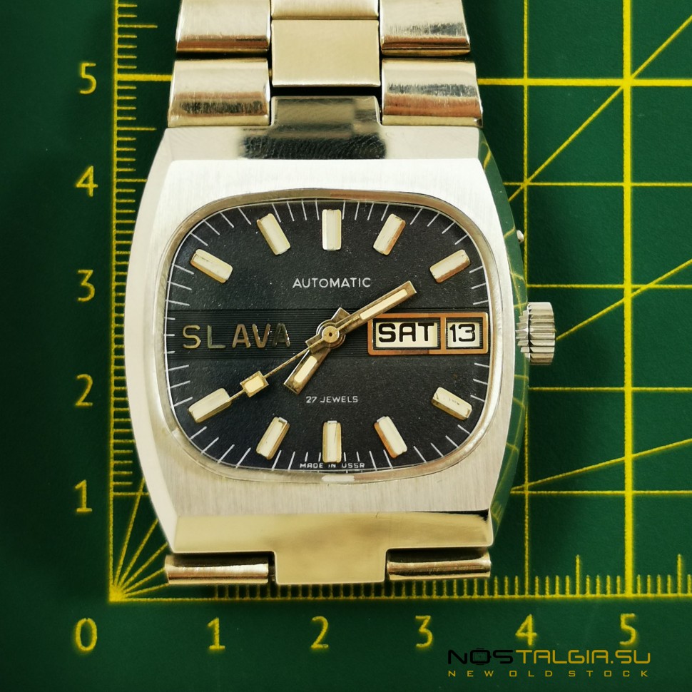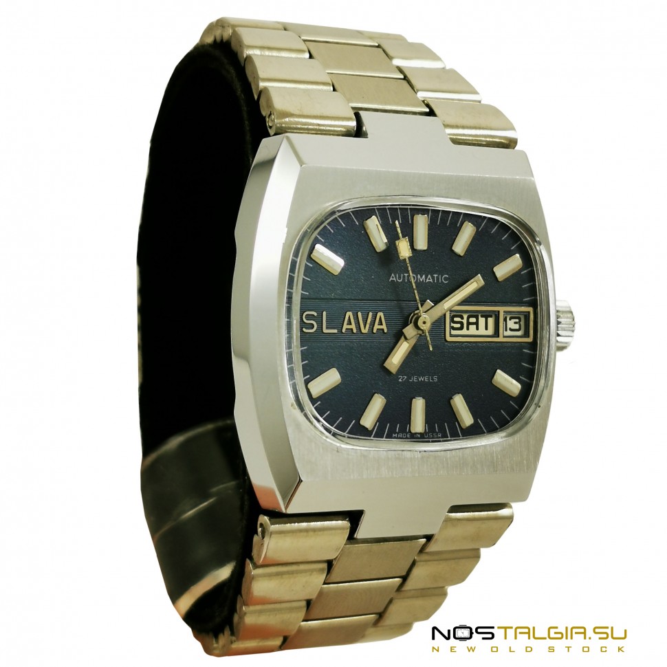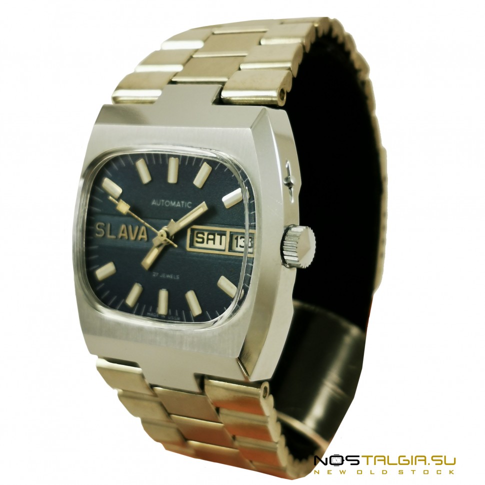 Mechanical watch "Slava" 2427 was produced in the Soviet Union by the Second Watch Factory (1985). Excellent external condition of the chrome case and bracelet (new from storage), the self-winding movement on 27 ruby stones underwent professional prophylaxis by a watchmaker this year. The blue dial features phosphor markers and an instant dual calendar showing the current day and day of the week. Dimensions: 46 mm x 43 mm (width with crown), strap base width: 18 mm. The Slava watch implements the best achievements of the Soviet Union! We guarantee the quality of our watches! Delivery to any city in the world!