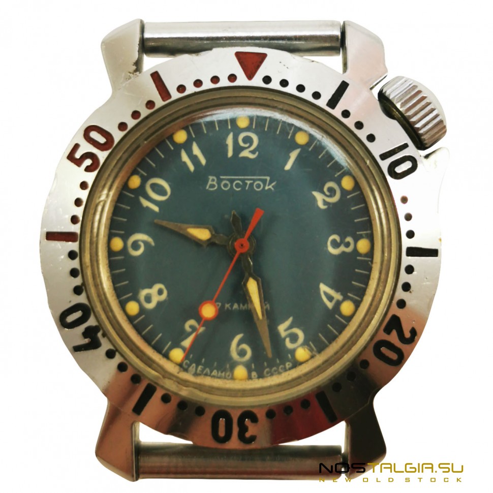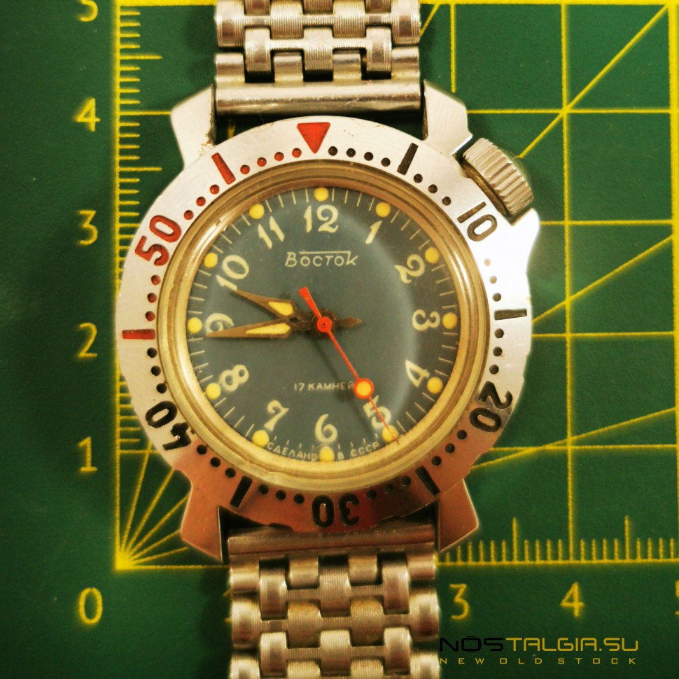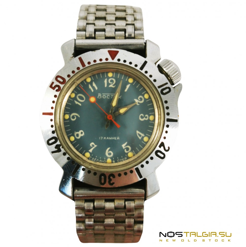 The Vostok wrist watch in a small case, was previously in careful use, produced by the Chistopol watch factory in the Soviet Union. The external condition of the waterproof case is good, the anti-magnetic mechanism on 17 ruby stones has undergone preventive maintenance this year. Included: watch, native metal bracelet, branded box. On the blue dial are Arabic with phosphoric markers. Dimensions: 43 mm x 37 mm (width with crown), strap base width: 18 mm. Delivery to any city in the world.