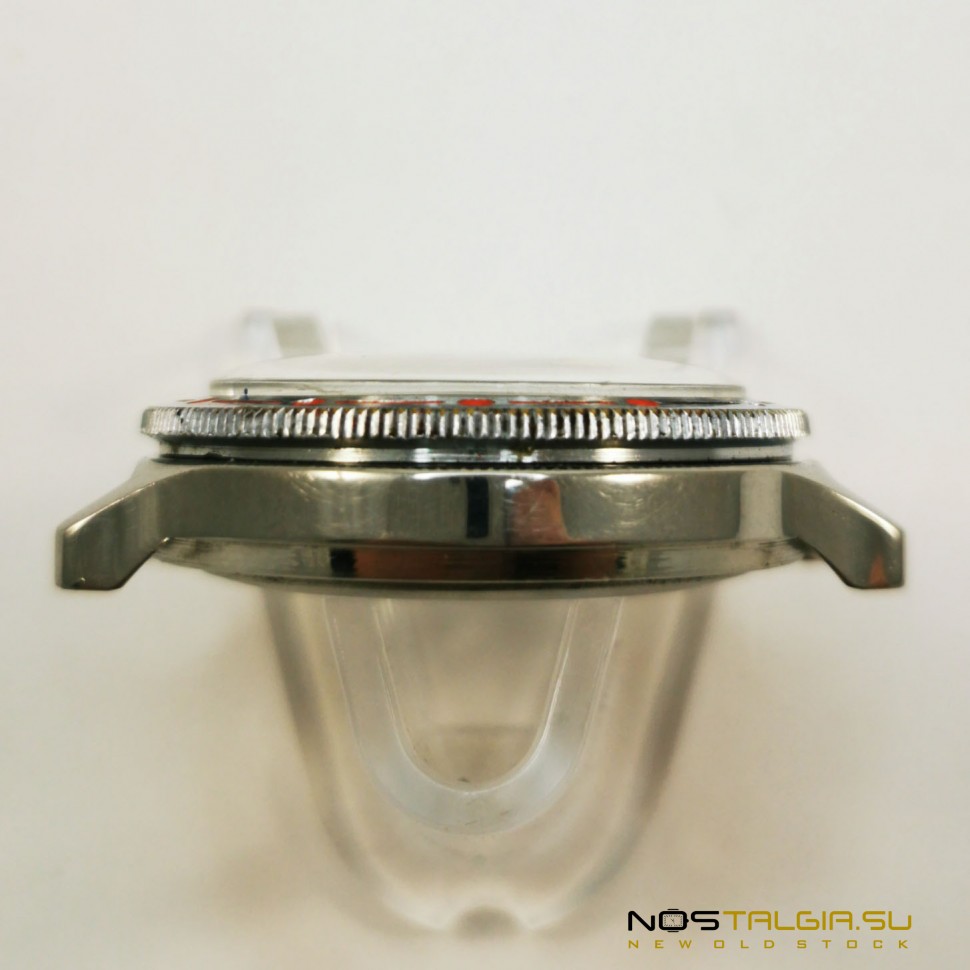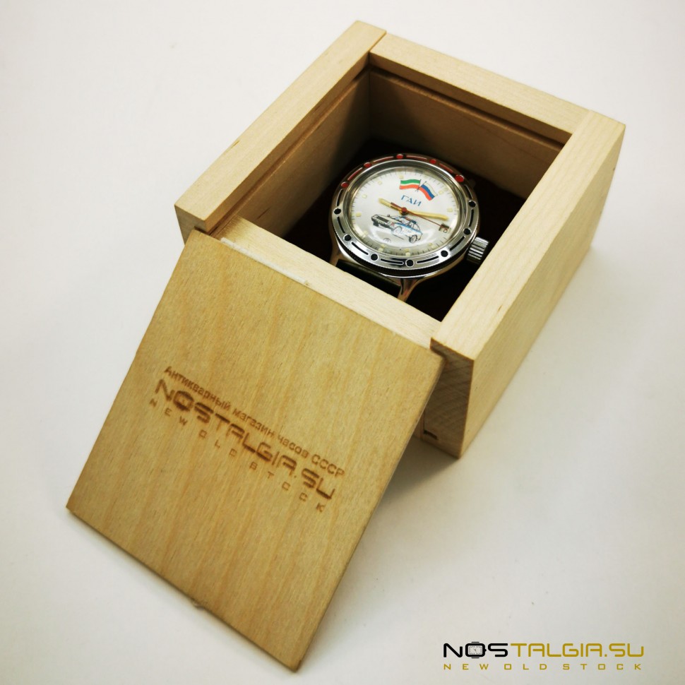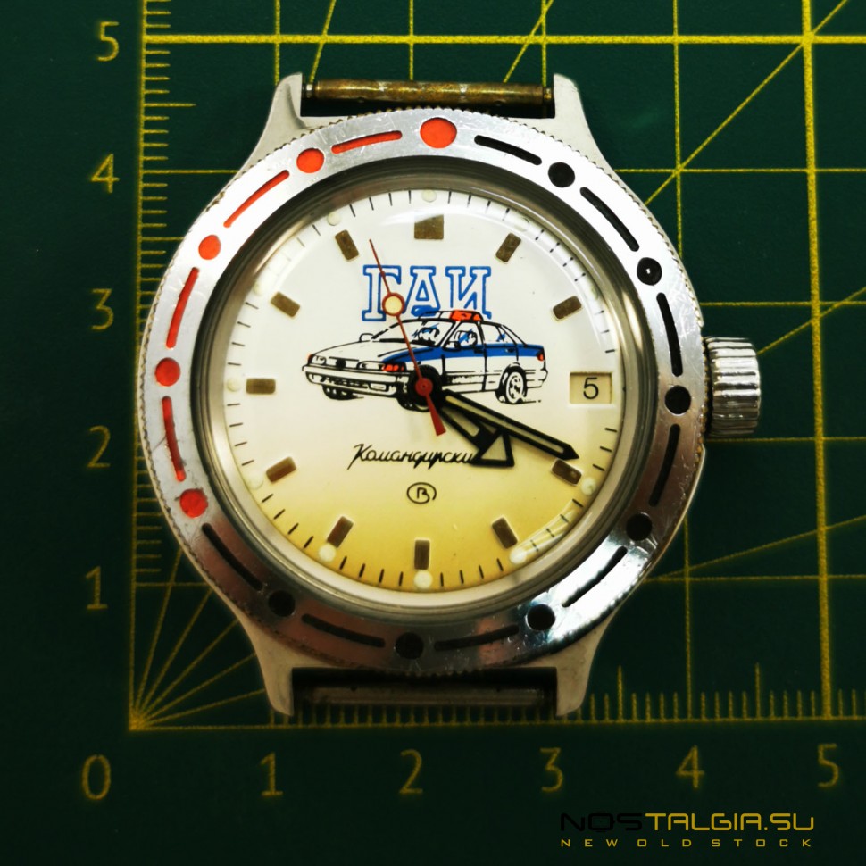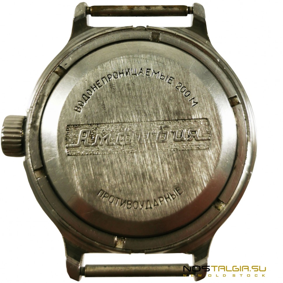 Mechanical watch "Vostok" Amphibia was produced for the state automobile inspection by the Chistopol watch factory. Waterproof (200 m.), Shockproof case is in excellent condition, the mechanism underwent technical preventive maintenance in 2020. The white dial features phosphor markers and an instant calendar on the side showing the current date. Includes: watch, branded box. Dimensions: 45 mm x 43 mm (width with crown), strap base width: 18 mm. Delivery to any city in the world.