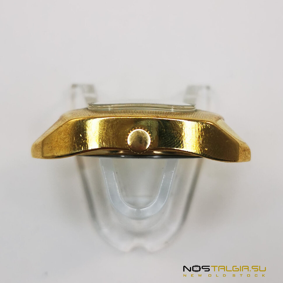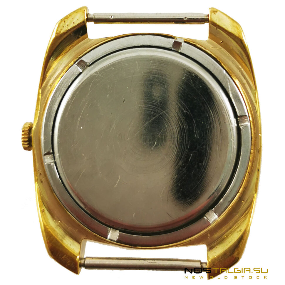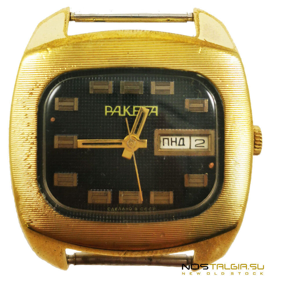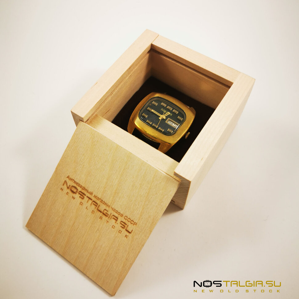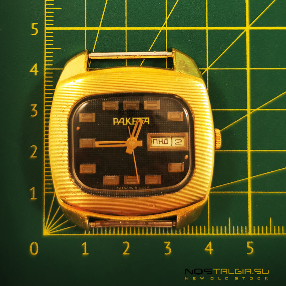 Механические часы "Ракета" 2628H произведенные в Советском Союзе в 1974 году, модель в народе называлась "Большой Телевизор". Часы бывшие в использовании, имеются небольшие потертости. Красивый черный циферблат с двойным календарем (день недели, число) в сочетании с корпусом золотого цвета придают часам дорогой вид. Механизм полностью исправен, проведена профилактика у часового мастера. В комплекте: часы, подарочная коробочка. Размеры: 44 мм х 42 мм (ширина с заводной головкой), ширина основания ремешка: 20 мм. Доставка в любой город мира.