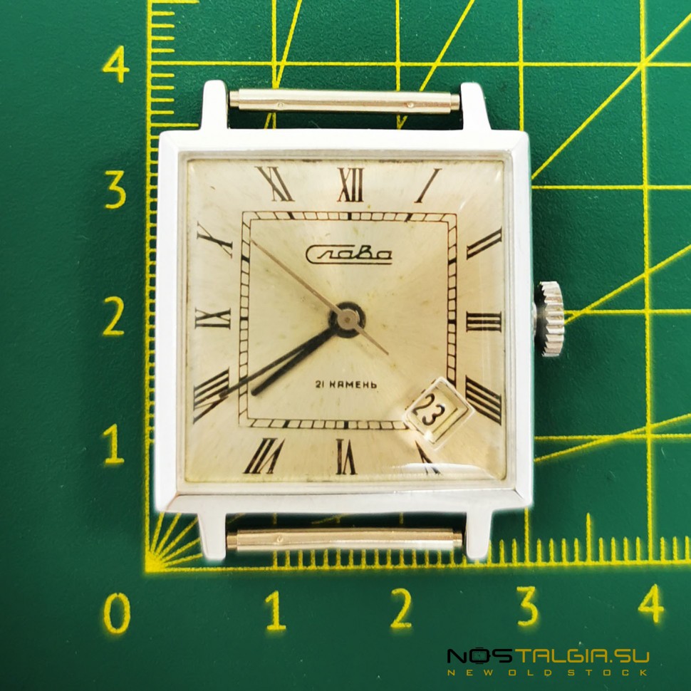 Hermoso reloj de pulsera mecánico "Slava" de la URSS (cuadrado). ¡Modelo bastante raro! La caja cromada está en buenas condiciones (hay micro-rayones). Movimiento 2209 sobre una piedra de rubí 21. El reloj está bien conservado para esta época. La esfera tiene números romanos y un calendario que muestra la fecha actual. Dimensiones: 39 mm x 33 mm (ancho con corona), ancho base de la correa: 18 mm. Adecuado como regalo vintage para una persona comprensiva o se convertirá en un adorno de su colección personal. ¡Siempre puede comprar relojes mecánicos raros de la URSS en nuestra tienda en línea a precios razonables con garantía de calidad! Entrega a cualquier ciudad del mundo.