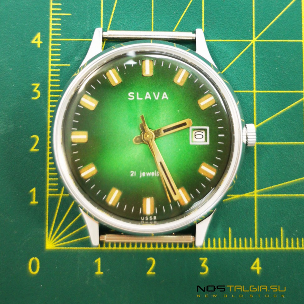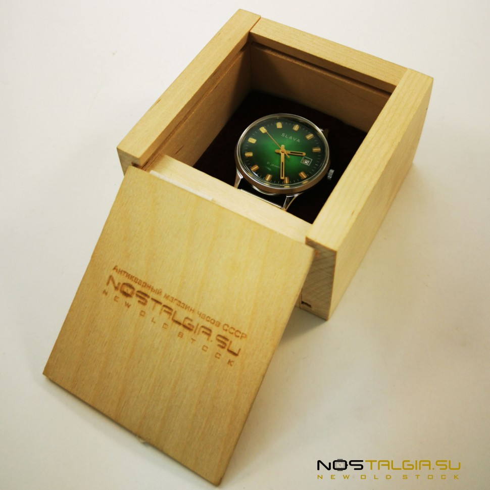 La montre-bracelet Slava est neuve de stockage, produite en URSS par la Second Watch Factory. La montre est en excellent état extérieur et technique (le mécanisme de la 21e pierre rubis a subi un entretien). Le magnifique cadran émeraude comporte un calendrier latéral instantané indiquant la date actuelle. Inclus: montre, boîte de marque. Dimensions: 43 mm x 40 mm (largeur avec couronne), largeur de la base du bracelet: 18 mm. Vous pouvez choisir un bracelet de haute qualité pour tous les goûts sur notre site Web. Livraison dans n'importe quelle ville du monde !!!