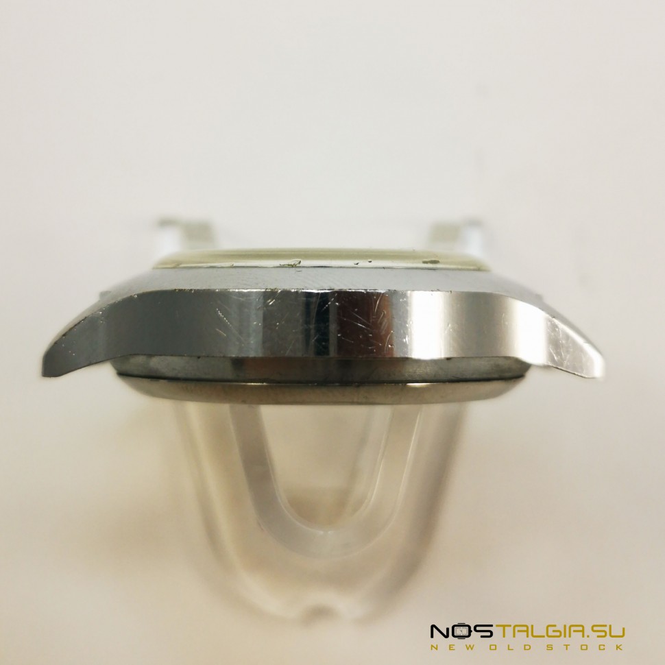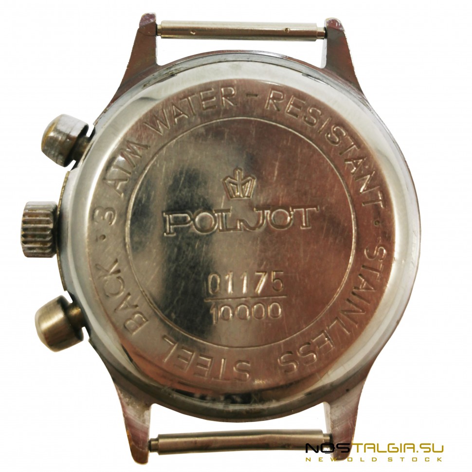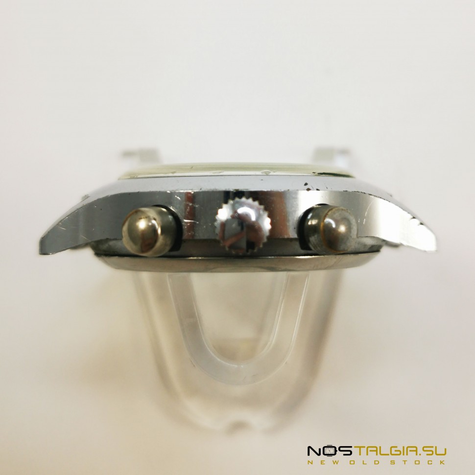 La montre Poljot Chronograph a été produite en Union soviétique par la 2ème manufacture horlogère. L'état extérieur du boîtier étanche chromé est bon (il était auparavant utilisé avec précaution), le mouvement est basé sur 23 pierres rubis, toutes les fonctions du chronographe sont testées et fonctionnent correctement, la montre est sur le cap exact. Sur le cadran blanc, il y a des flèches et des chiffres arabes en noir, un calendrier instantané avec le numéro actuel (position basse). Inclus: montre, boîte de marque. Dimensions 47 mm x 44 mm (largeur avec couronne), largeur de la base du bracelet: 18 mm. Livraison dans n'importe quelle ville du monde.