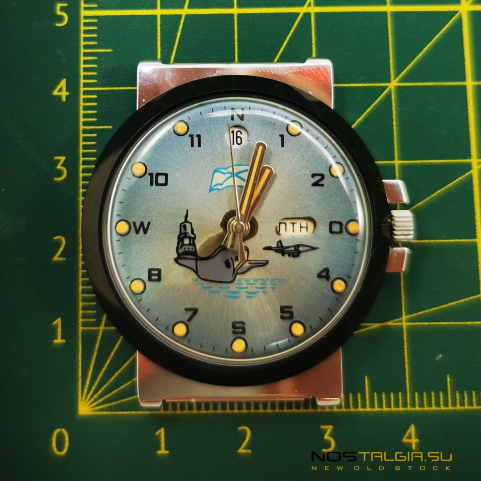 השעון המכני "Raketa" 2614-N הופק לכבוד הצי הרוסי על ידי מפעל השעונים Petrodvortsov. מצבו החיצוני של המארז המצופה כרום מעולה (השעון חדש מאחסון), המנגנון עבר מניעה על ידי יצרן השעונים השנה. החוגה הכחולה כוללת את הצי, לוח שנה מיידי כפול עם פריסה יוצאת דופן. כלול: שעון, דרכון עם מספרים תואמים, תיבת מפעל. מידות: 44 מ"מ x 41 מ"מ (רוחב עם כתר), רוחב בסיס רצועה: 18 מ"מ. משלוח לכל עיר בעולם.
