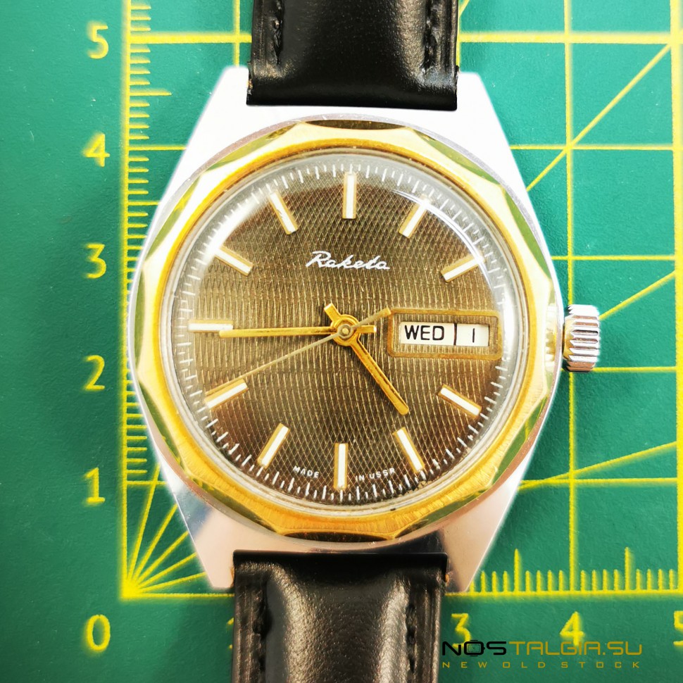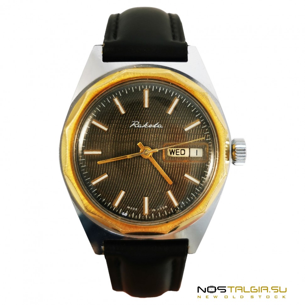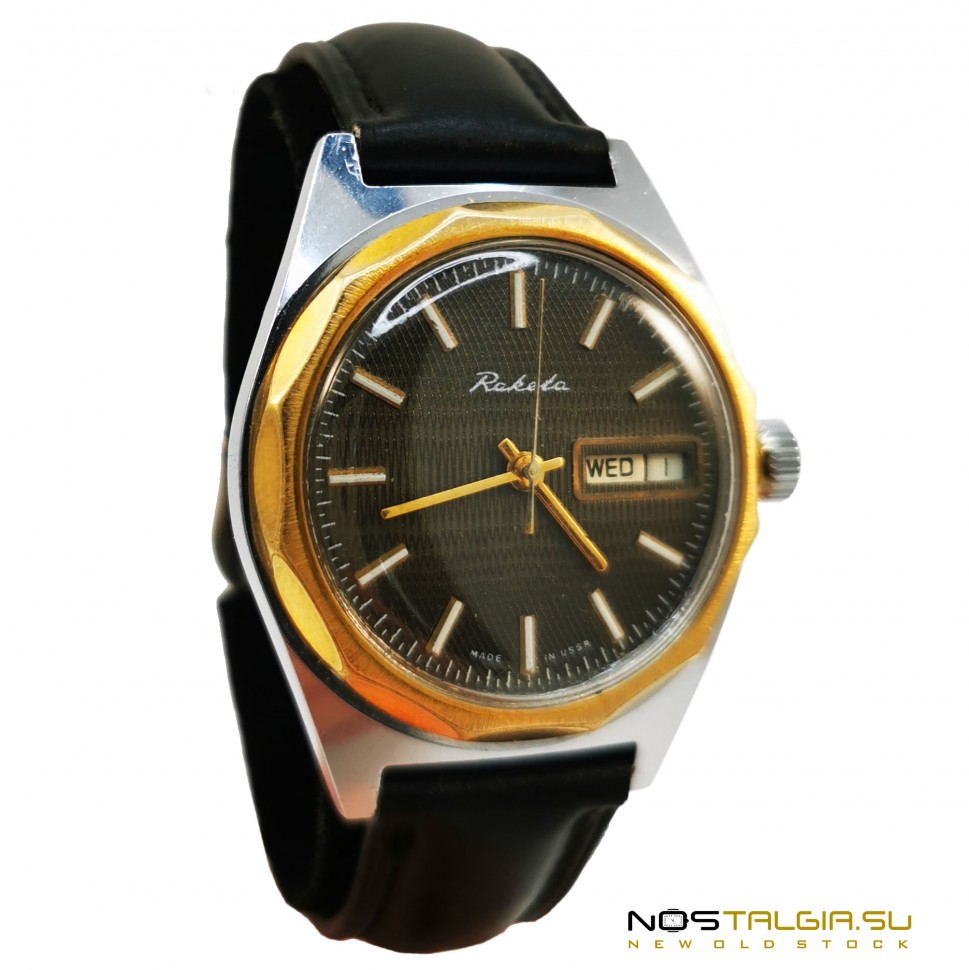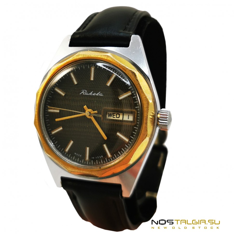 "ロケット"を見る-高品質のメカニズム2628で。Nは一般にソ連のPetrodvorets時計工場によって生成された"ロレックスナット"と呼ばれます。 ケースの外部状態は良好です(保管からの新しい)、メカニズムは今年プロの時計職人によって定性的にチェックされました。 ブラックダイヤルには、現在の日付と曜日を示す矢印(金色)と二重(ロシア語)のインスタントカレンダーがあります。 含まれています:時計、黒革ストラップ、ブランドのボックス。 次元:48のmm x43のmm(王冠との幅)、革紐の基盤の幅:18のmm。