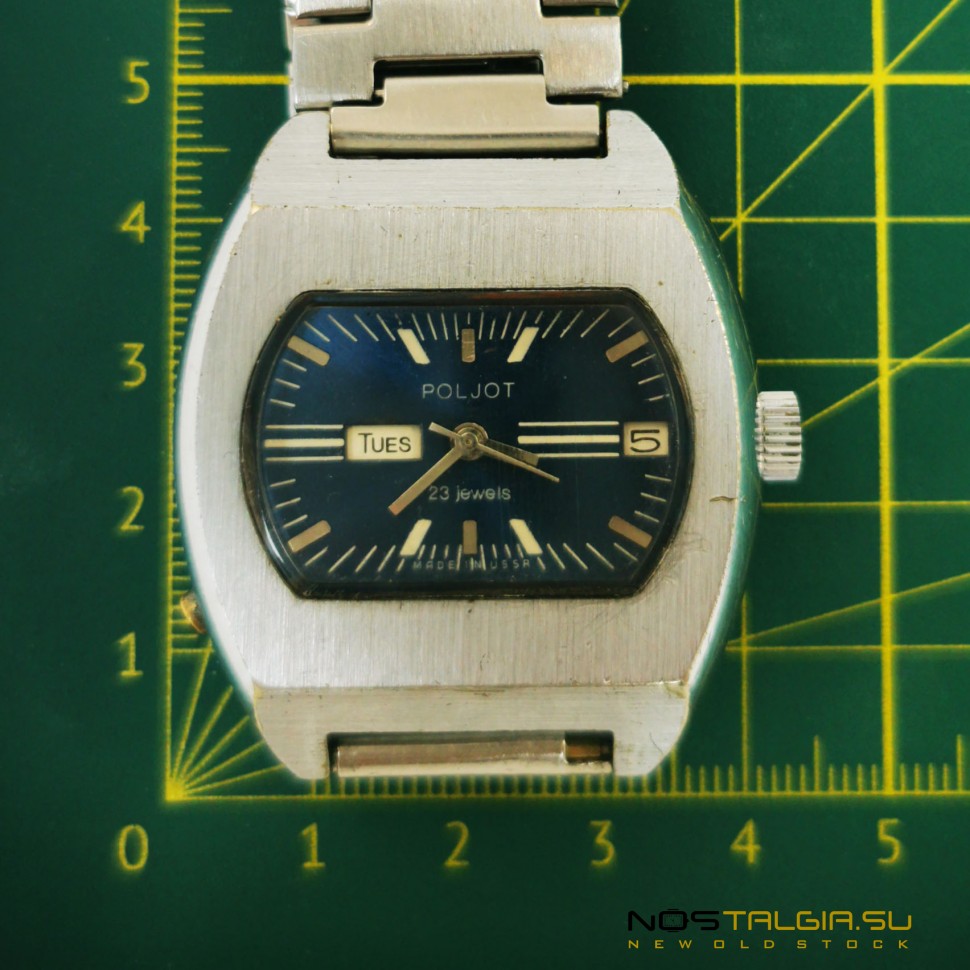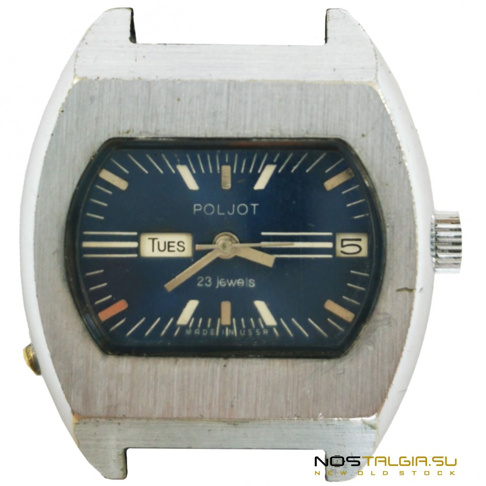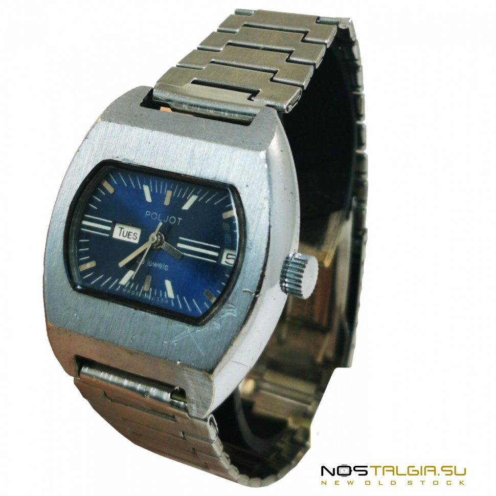 非常に珍しい手首の機械式時計「Poljot」は、ソビエト連邦で最初のモスクワ時計工場によって製造されました。クロームメッキのケースは良好な状態です(時計は慎重に使用されていました)-正確な動き、23ルビーの石のメカニズムは2020年にマスターによって予防されました。美しい青い文字盤には、現在の曜日と曜日(左側に曜日、右側に番号)を表示する分割された二重カレンダーがあります。含まれるもの:時計、ネイティブメタルブレスレット、ブランドボックス。寸法:46 mm x 42 mm(クラウン付きの幅)、ストラップベースの幅:18mm。世界のあらゆる都市への配達。
