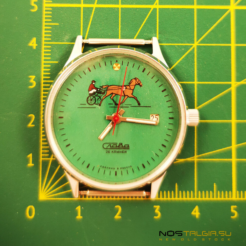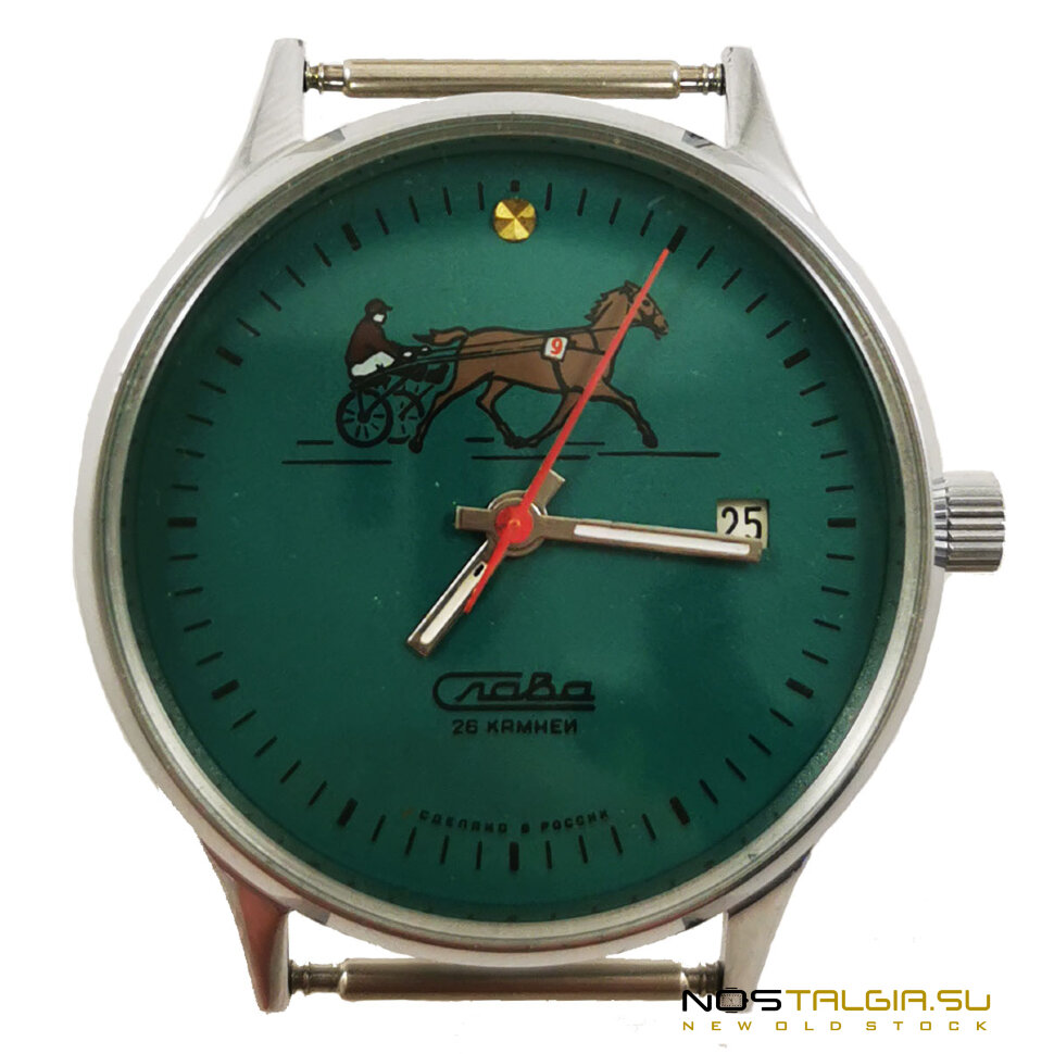機械式時計「スラバ」は競馬に敬意を表してロシアで作られました。ケースの外観は良好(保管状態から見た場合)であり、技術的に完全に保守可能です(時計メーカーによる予防措置を受けています)。クロームメッキのケースと緑色の文字盤に馬の馬をイメージした興味深い組み合わせ。内容:時計、ブランドボックス。寸法:42 mm x 41 mm(リューズを含む幅)、ストラップベースの幅:18 mm。世界のどの都市への配達。