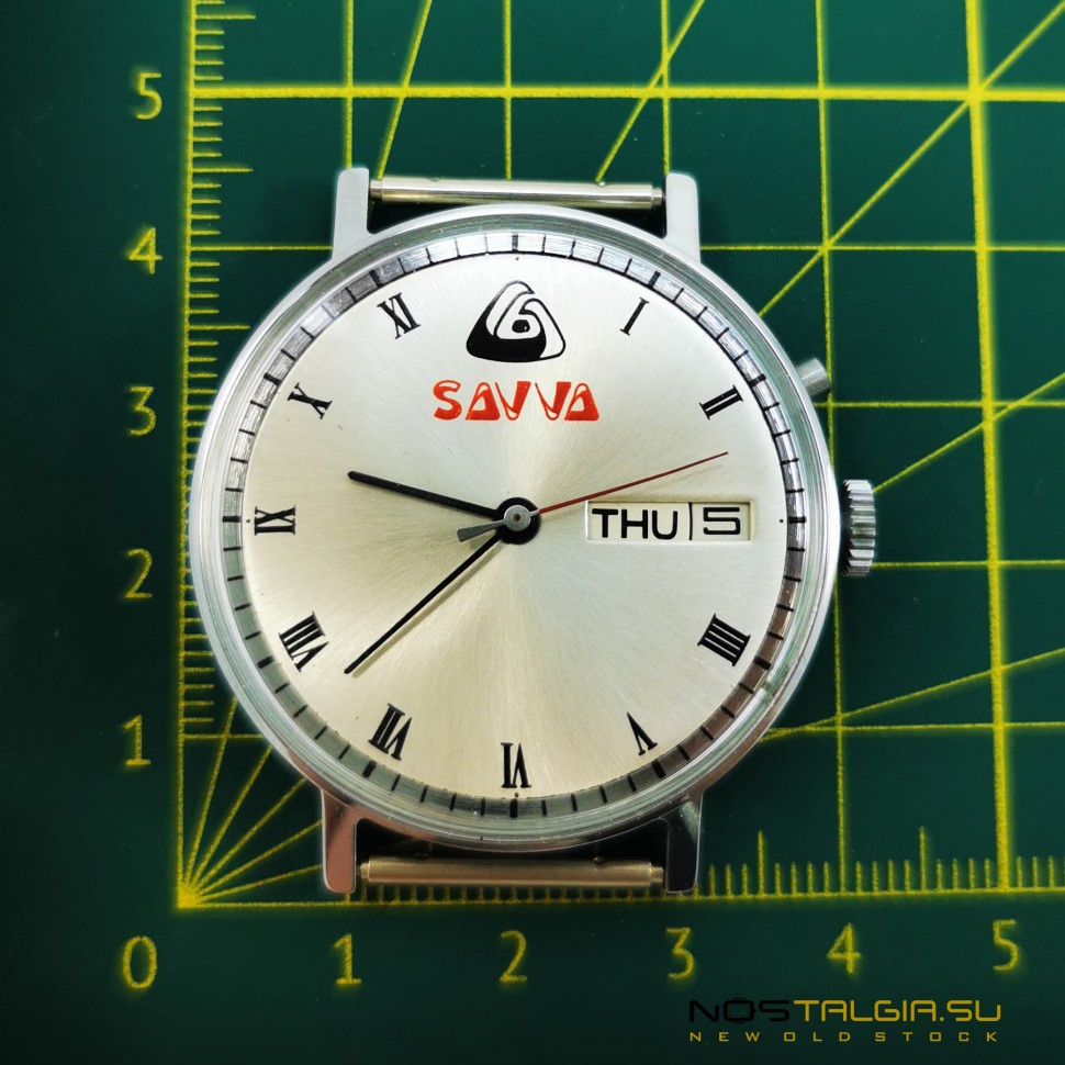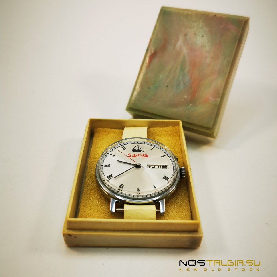 기계식 시계"Slava"저장소에서 새로운,두 번째 시계 공장에서 소련에서 생산. 방진 및 방습 케이스는 우수한 상태이며 기술적으로 완벽하게 수리 할 수 있습니다(2021 년 시계 제조사가 서비스했습니다). 다이얼에는 현재 요일과 요일의 표시가있는 측면(영어)달력이 표시됩니다. 포함:시계,공장 상자. 크기:45mm x42mm(크라운 너비),스트랩 받침대 너비:18mm.!!