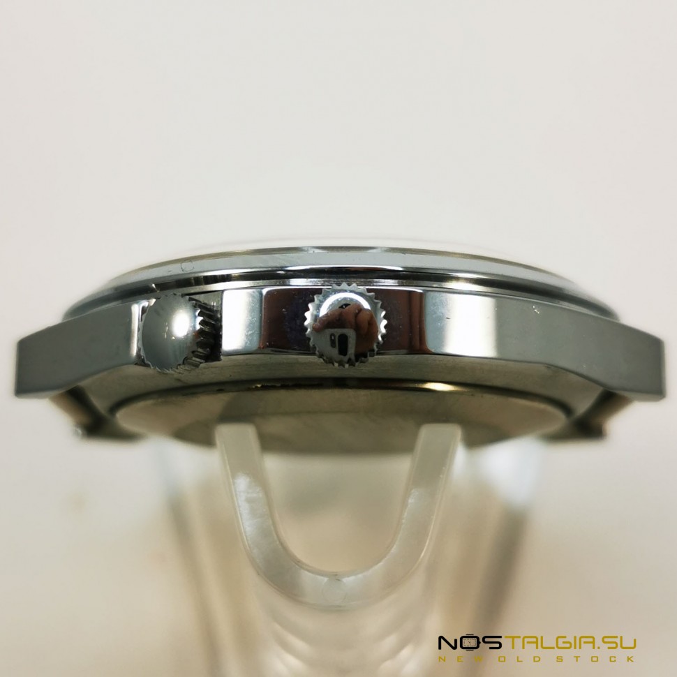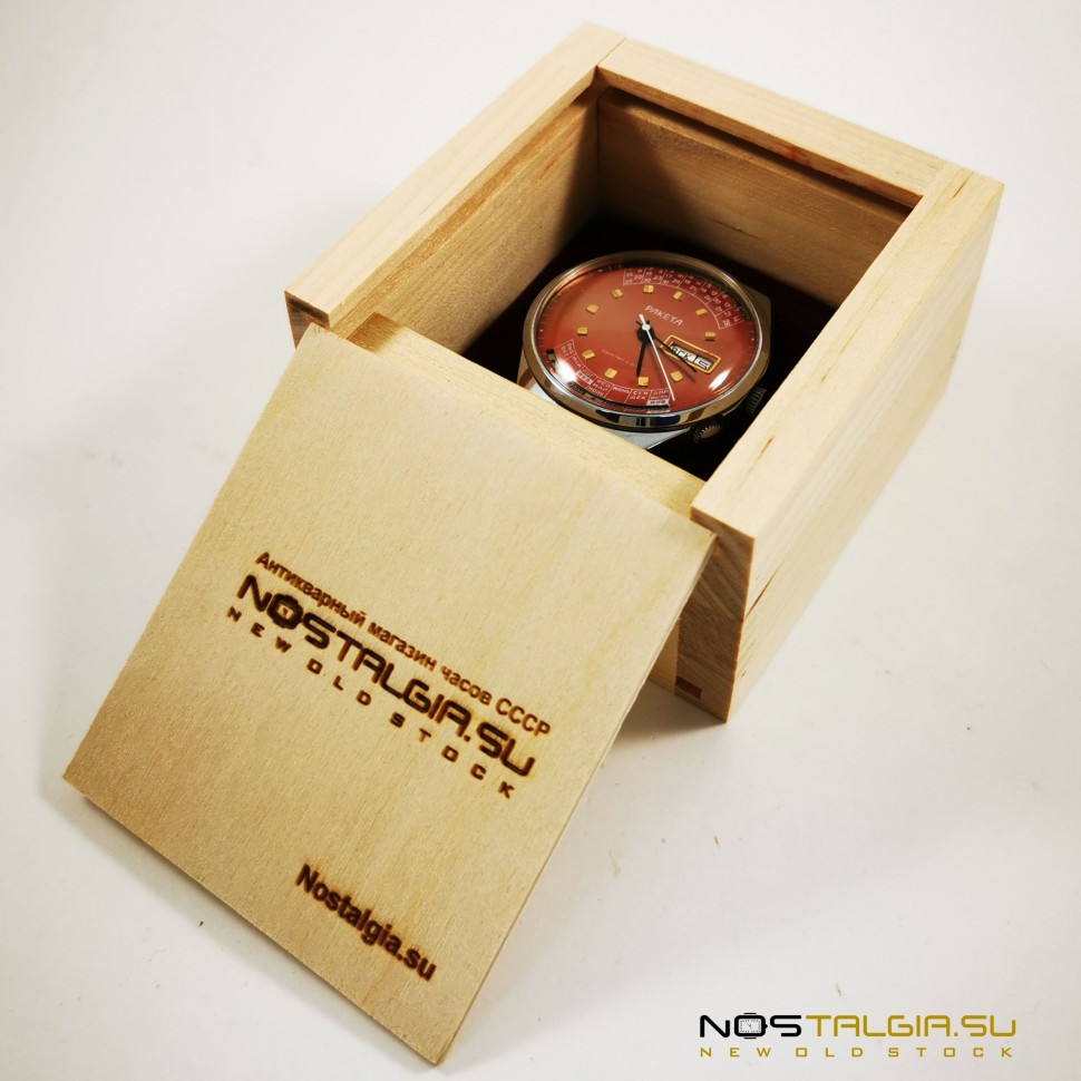 Отличные часы "Ракета" - "Вечный календарь", произведены в Советском Союзе Петродворцовым часовым заводом. Никогда не были в использовании - новые с хранения. Механизм 2628 прошел профессиональное обслуживание в 2021 году. На багряном циферблате находится "Вечный календарь" и боковой (двойной) календарь мгновенного действия с указанием текущей числа и дня недели. В комплекте: часы, фирменная коробочка. Размеры: 44 мм х 44 мм (ширина с заводной головкой), ширина основания ремешка: 18 мм. Доставка в любой город мира.